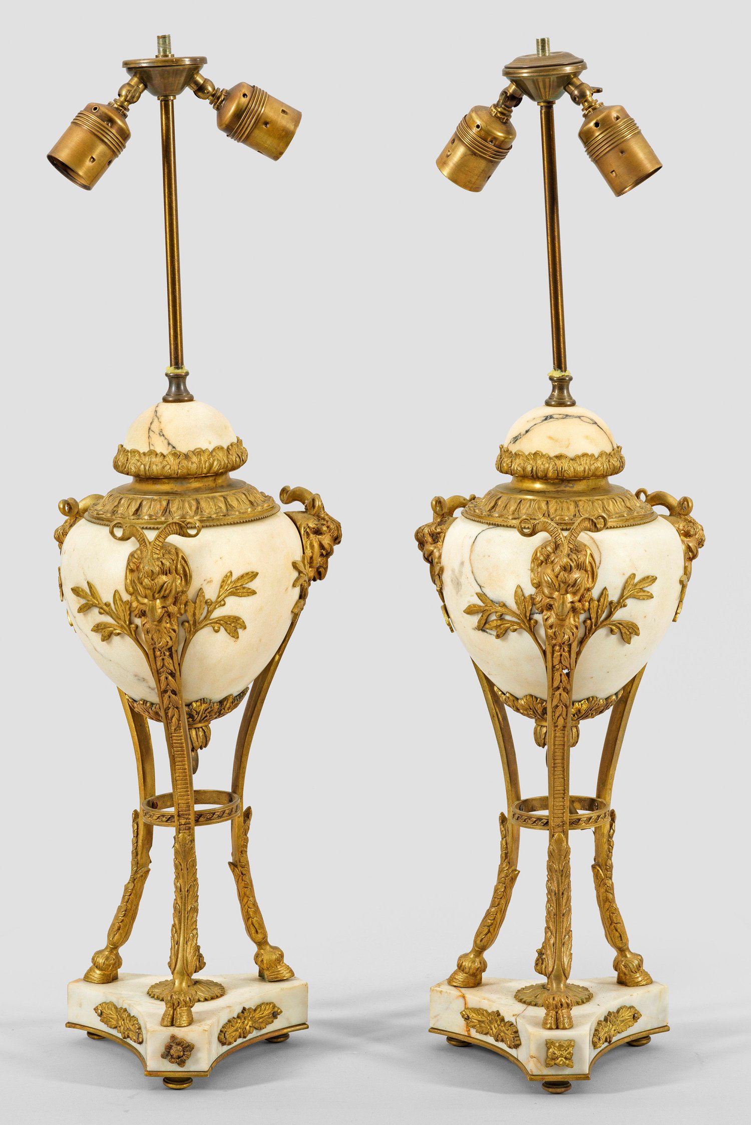 2-flg.; Cremefarben gemaserter Marmor und Bronze. Über dreiseitig konkav eingezogener Basis gebogte Streben mit reliefplastischen Bocksköpfen als Träger für balusterförmigen, blattreliefierten Korpus. Oberhalb schmaler Schaft als Träger für Leuchtmittel. Elektrifiziert. H. 71 cm.