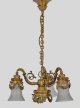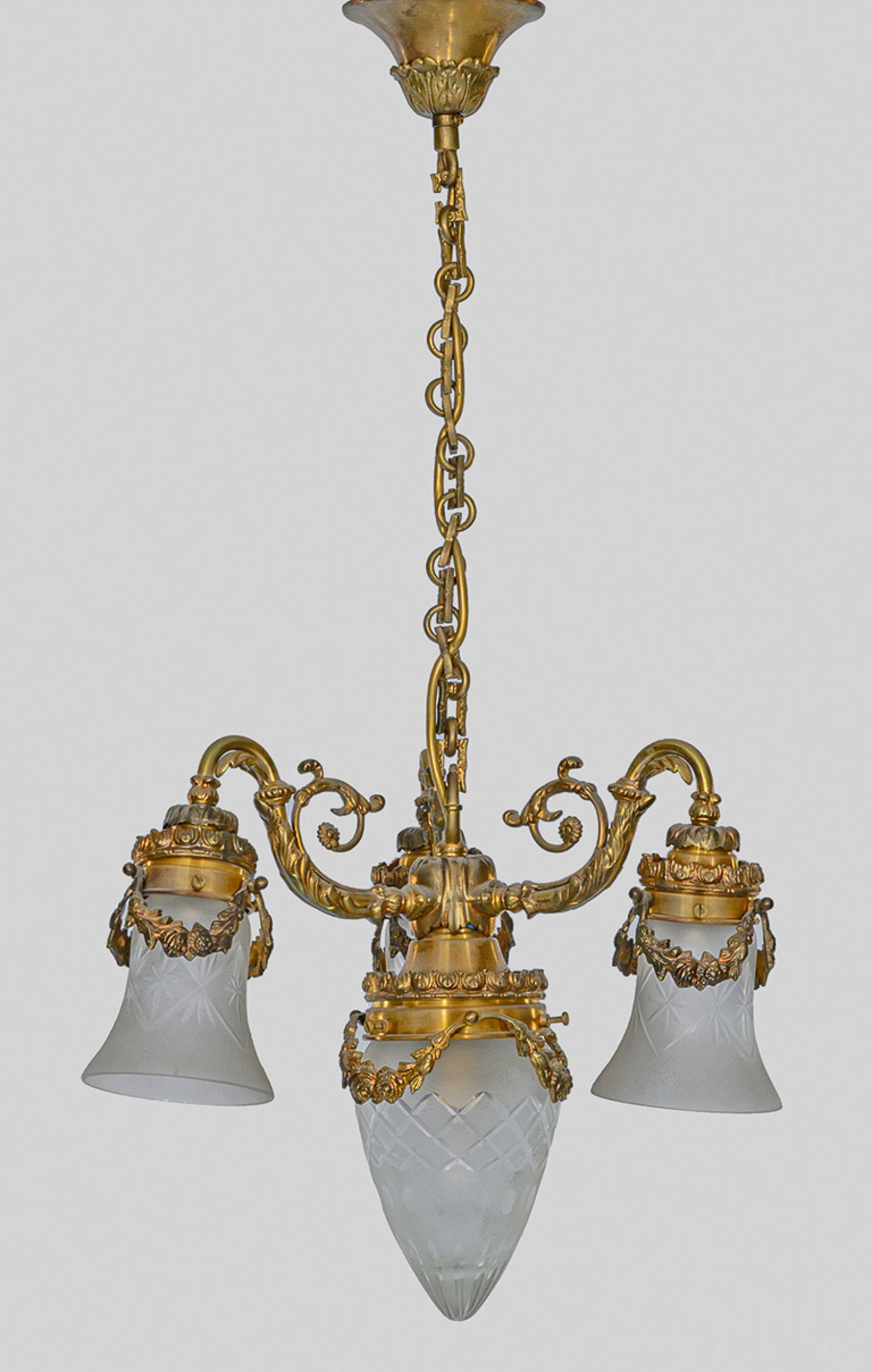 4-flg.; Messing und farbloses, satiniertes Glas. Tropfenförmiger Korpus mit Festonmotiven. Oberhalb davon ausgehend drei geschwungene Leuchterarme mit kelchförmigen Lampenschirmen. Kettenaufhängung. Elektrifiziert. Ein Korpus fehlt. Ges.-H. 80 cm. D. 38 cm.