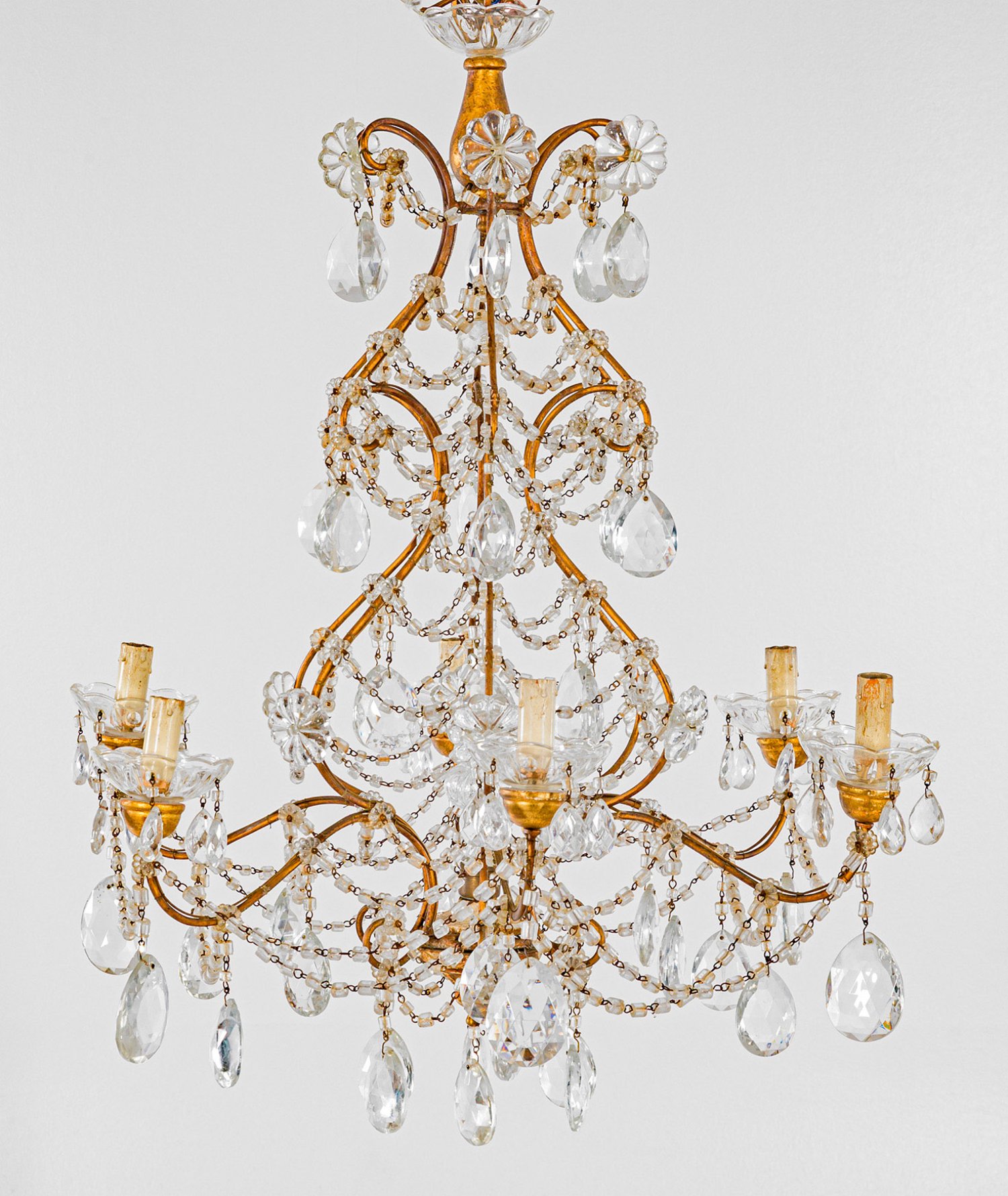 6-flg.; Goldfarben lackiertes Metall und Holz sowie farbloses Glas. Offen gestalteter Korpus aus stark geschwungenen, balusterförmig angeordneten Streben, durch Prismenschnüre verbunden. Korrespondierende, geschwungene Leuchterarme als Träger für Leuchtmittel. Reicher Behang aus facettierten Prismen. Elektrifiziert. H. 80 cm. D. 68 cm.