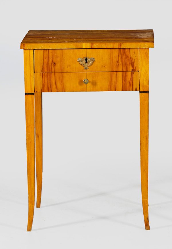 Apfelholz, furniert. Gerader Zargenkasten auf konischen, leicht ausgestellten Vierkantbeinen. In der gegliederten Front zwei Schubfächer, teilw. mit Facheinteilung. Gering überstehende, rechteckige Deckplatte. H. 73 cm. 50 cm x 43 cm.