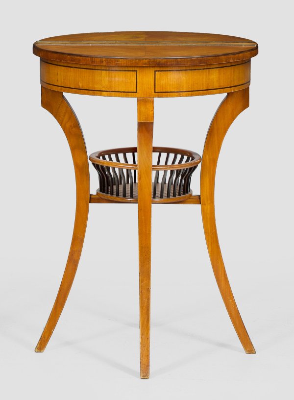 Kirschbaum, furniert. Bombierter Zargenkasten auf konkav eingezogenen, konischen Vierkantbeinen, unterhalb durch schmale Stege für Wollkorb verbunden. Runde, zweiseitig aufklappbare Deckplatte. Unterhalb Facheinteilung. H. 74,5 cm. D. 52,5 cm.