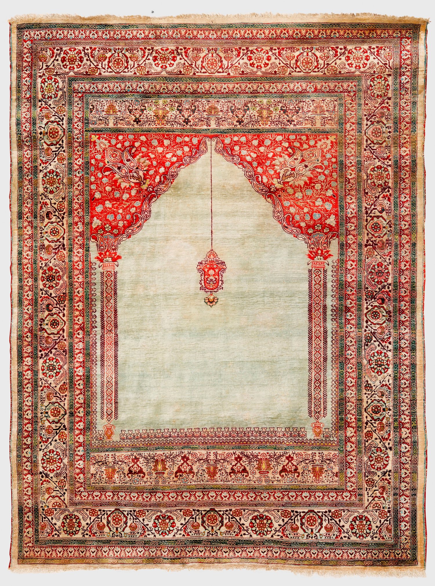 Persien. Seide auf Seide. Ca. 700.000 Knoten pro qm. Auf hellgrünem Fond architektonisch gegliedertes Nischenmotiv aus schlanken Säulen und zentraler Ampel. In den hellroten Reserven flächendeckende Blütenmusterung. Umlaufend breite Palmettenbordüre, flankiert von schmalen Bändern. 163 cm x 121 cm.