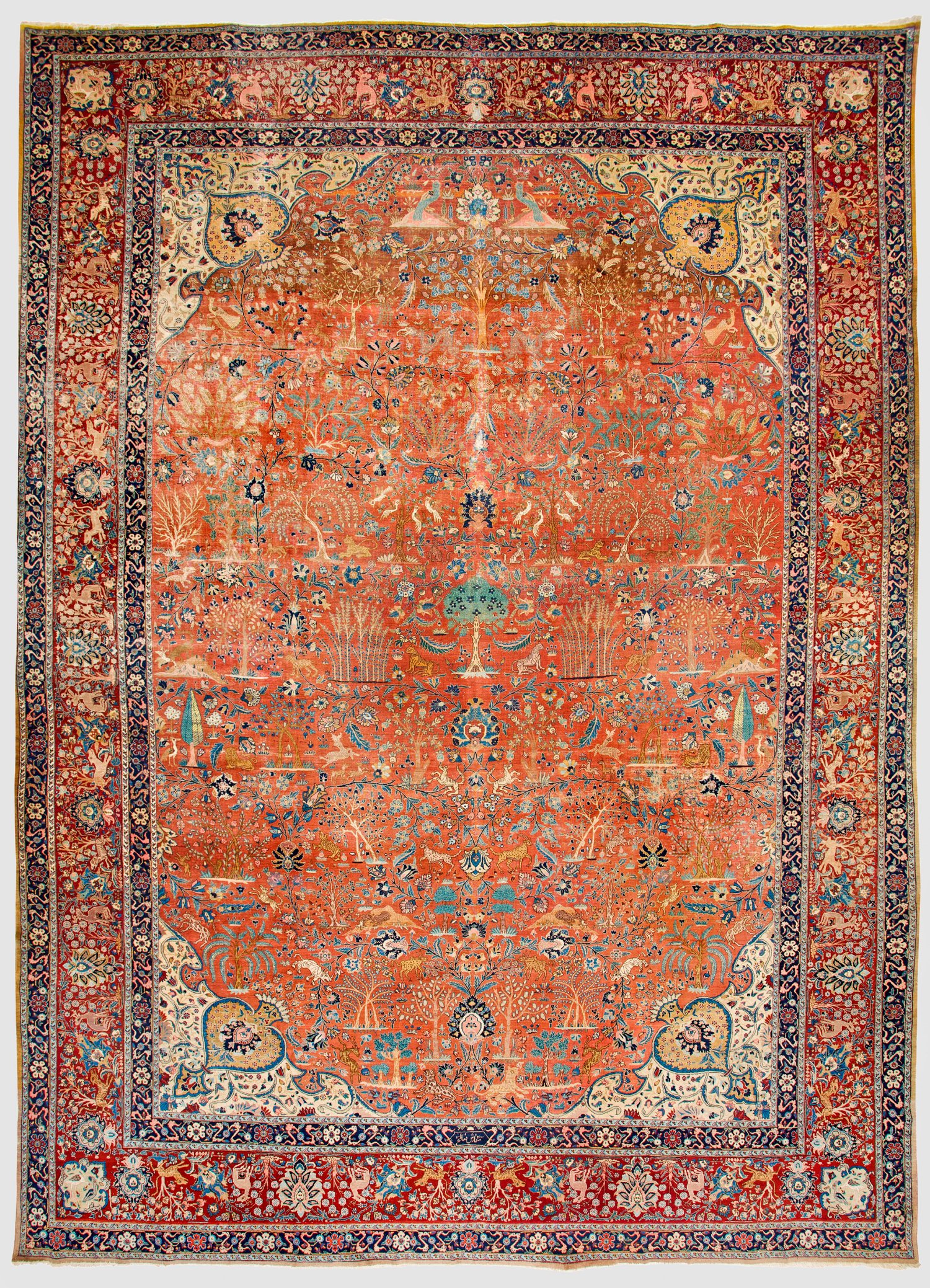 Persien. Wolle auf Baumwolle. Naturfarben. Im hell rotbrauen Innenfeld flächendeckend durchlaufende, detailreiche Paradiesgartenmusterung aus unterschiedlichen Baummotiven, Blütenrispen und unterschiedlichen Wildtieren, wie Löwen. Elfenbeinfarbene Ecklösungen. Umlaufend dunkelrote Hauptbordüre aus Palmetten und Blütenzweigen, begrenzt von schmalen Bändern. Sign.; Restaurierungsbedürftig. 660 cm x 486 cm.