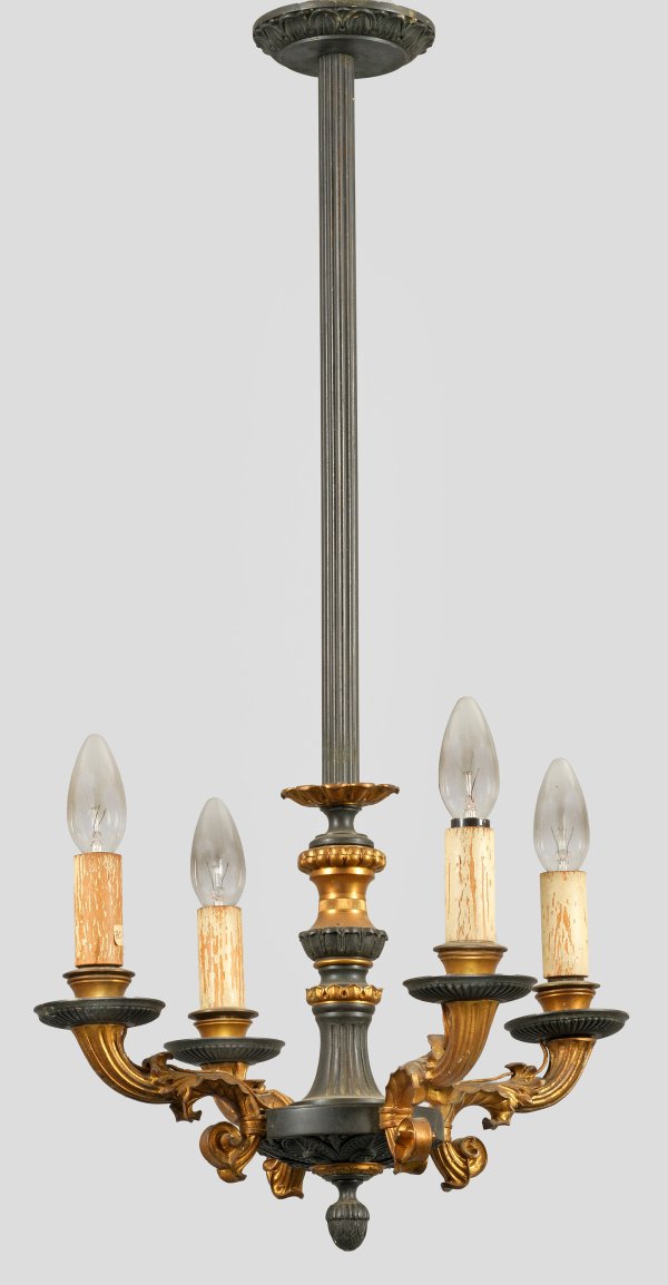 4-flg.; Schlanker, kannelierter Balusterschaft. Unterhalb davon ausgehend stark geschwungene volutenförmige Leuchterarme. Elektrifizierung erneuerungsbedürftig. H. 75 cm. D. 39 cm.