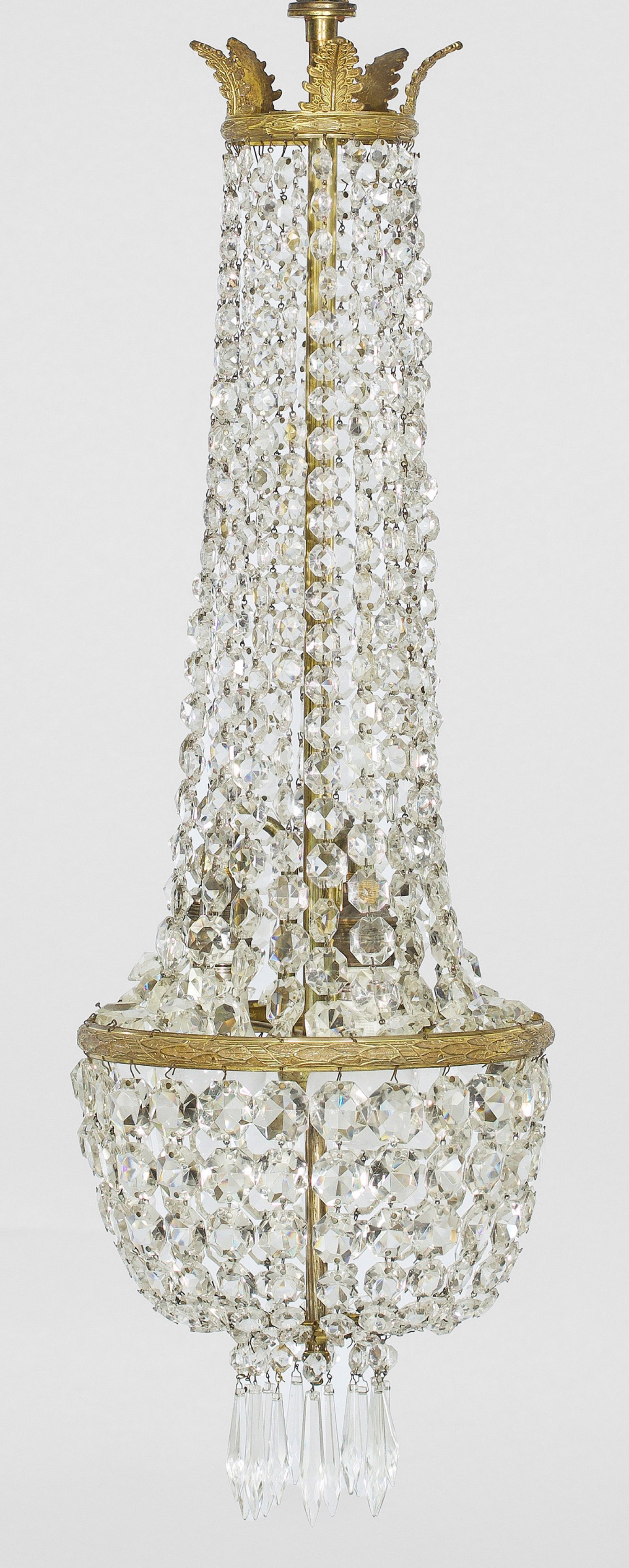 Messing und farbloses Kristallglas. Balusterförmiger Korpus aus Prismenschnüren im Verlauf sowie schmalem blattreliefierten Reif. Korrespondierender oberer Abschluss mit Palmettenbekrönungen. Innen drei Lampenfassungen. Elektrifiziert. H. 83 cm. D. 25 cm.