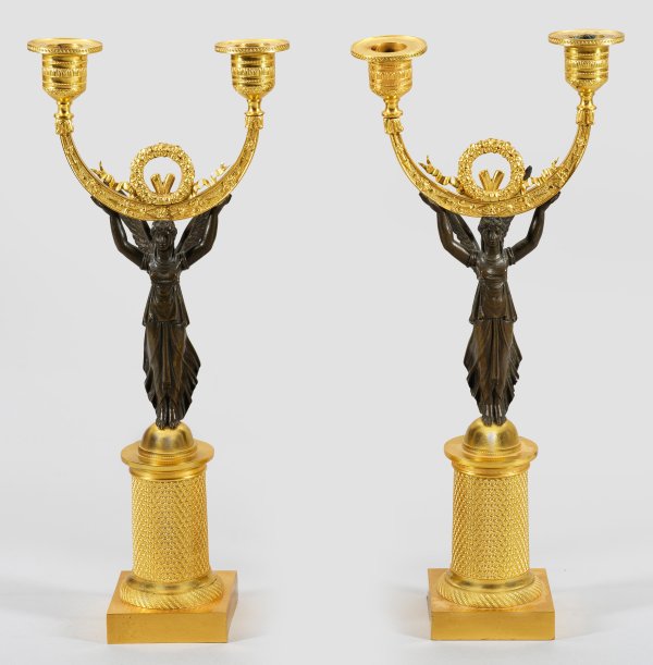 2-flg.; Bronze, vergoldet sowie teilw. dunkel patiniert. Über quadratischer Plinthe flächendeckend reliefierter Säulenschaft. Oberhalb davon ausgehend vollplastisch gestaltete Viktorien als Träger für stark gebogte Streben mit Kranzbekrönung sowie vasenförmige Tüllen. H. 36,5 cm.