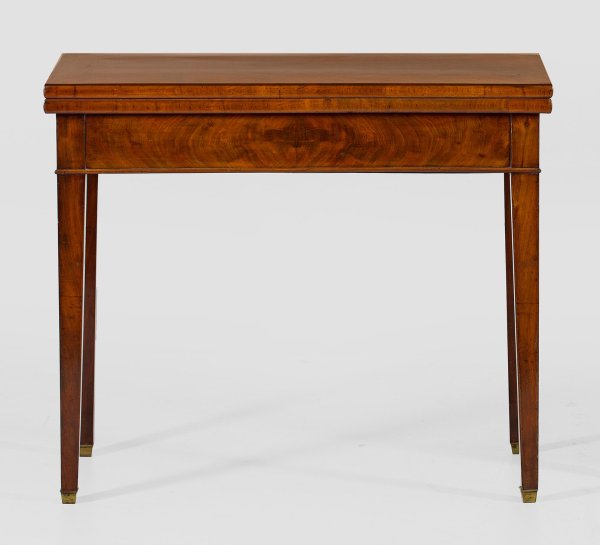Mahagoni, furniert. Gerader Zargenkasten auf konischen, rücks. ausziehbaren Vierkantbeinen. Gering überstehende, aufklappbare Deckplatte. Unterhalb Spielfläche aus grünem Filz. H. 73 cm. 85 cm x 42/84 cm.