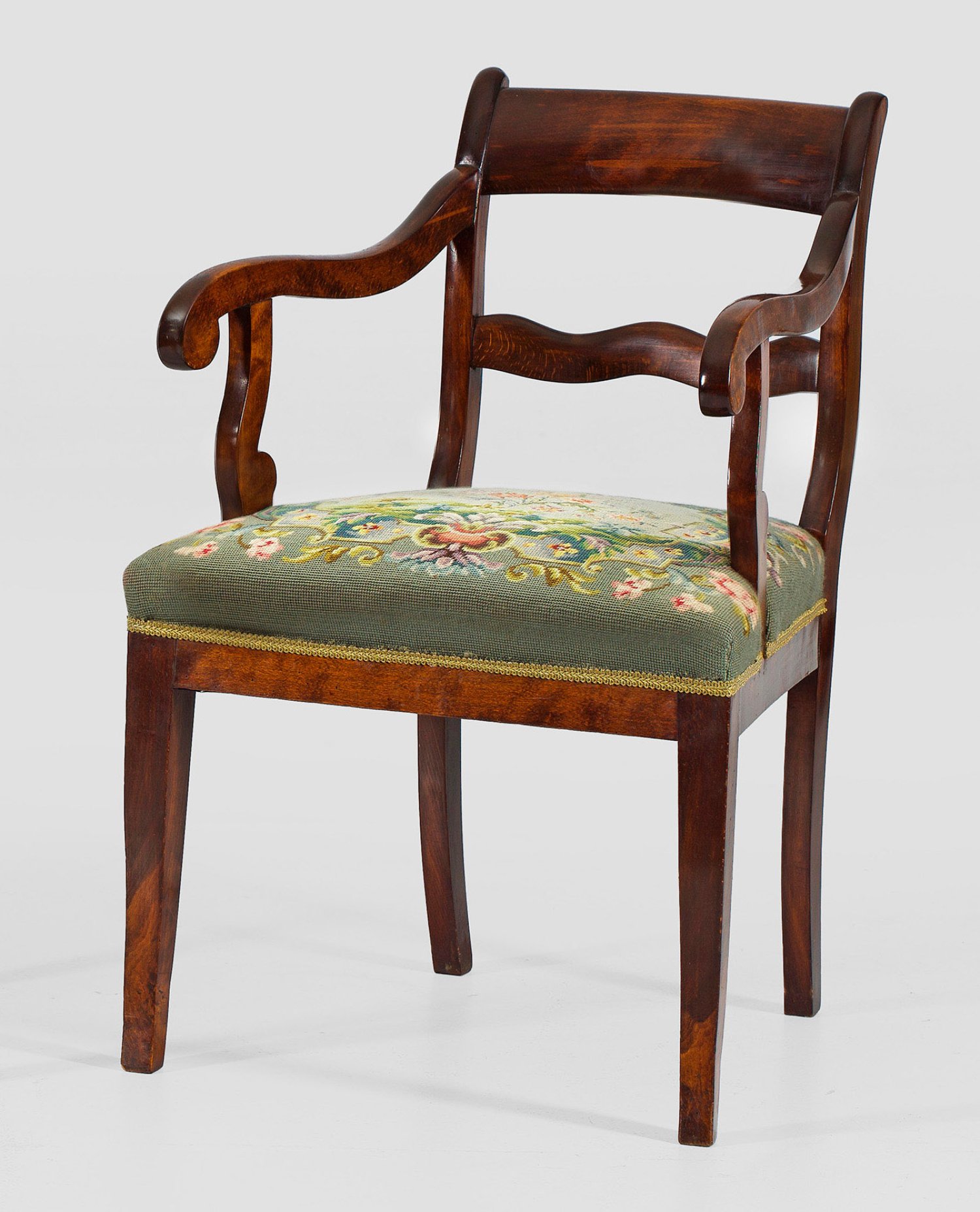 Buchenholz, mahagonifarben gebeizt. Trapezförmige Zarge auf leicht ausgestellten Vierkantbeinen. Gebogte Stützen für geschweift ansteigende Armlehnen, in leicht zurückschwingende Lehne übergehend. Sitzfläche gepolstert und mit Petit Point-Stickerei bezogen. Sitz-H. 51 cm.