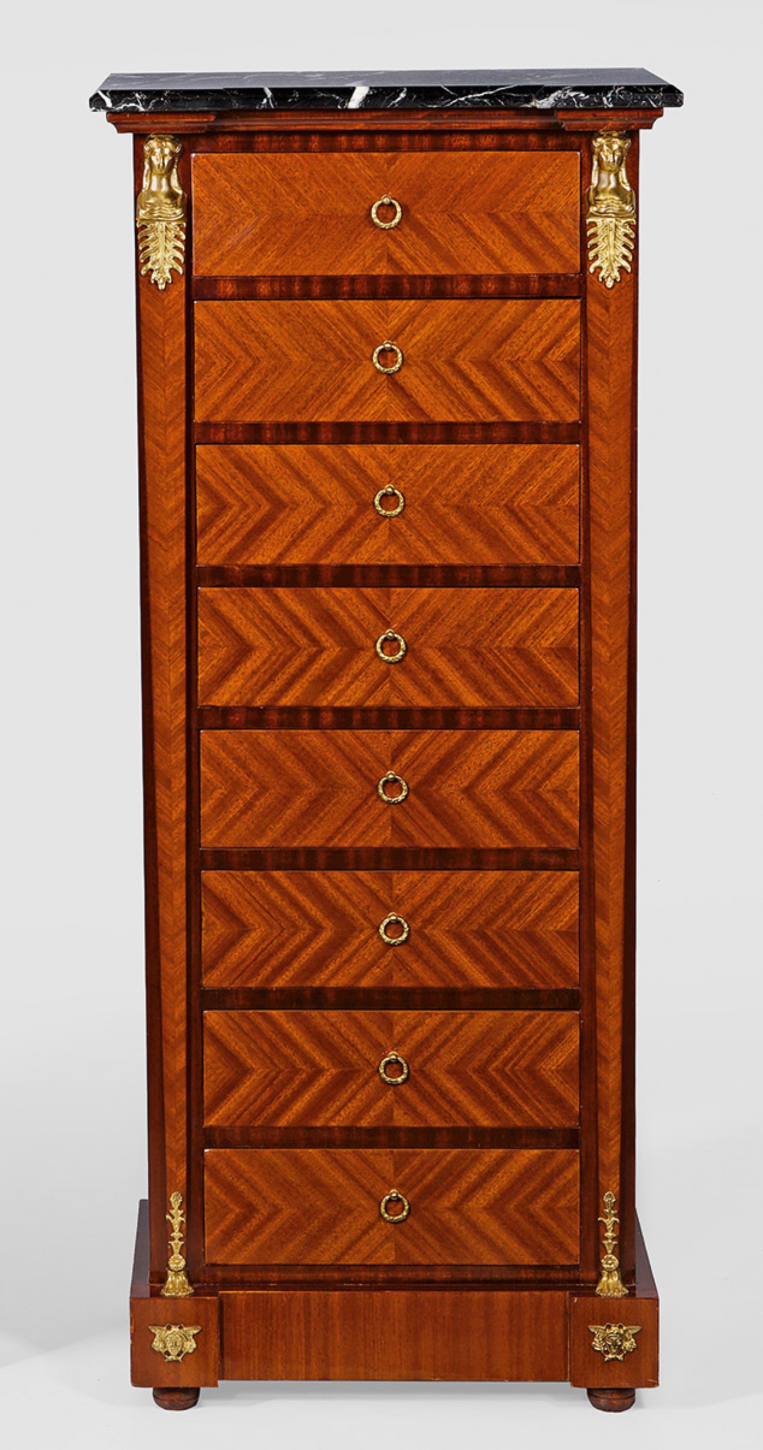 Mahagoni, furniert. Gerader, hochrechteckiger Korpus auf gekantetem Sockel. In der gegliederten Front acht Schubladen, flankiert von eingestellten Karyatiden. Deckplatte aus grau-weiß gemasertem Marmor. H. 134 cm. 57 cm x 35 cm.