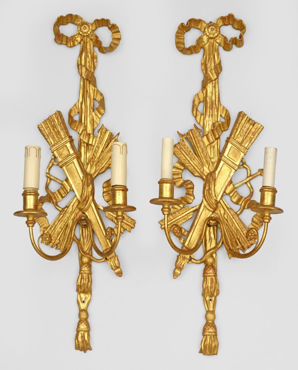 Gegenstücke. 2-flg.; Holz, reliefiert, gefasst und vergoldet. Durchbrochen gearbeitetes Wandschild aus Köcher- und Pfeilmotiven mit gestreckter Schleifenbekrönung. Davon ausgehend geschwungene Leuchterarme. Elektrifiziert. H. 62 cm.