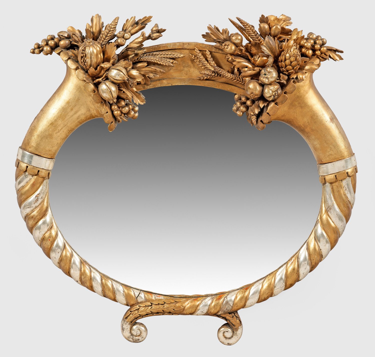 Holz, reliefplastisch geschnitzt und vergoldet. Ovale, breit gerahmte Spiegelrahmung aus gegeneinander gestellten godronierten Füllhörnern mit üppigen Fruchtdekor und Ähren. 89 cm x 90 cm.