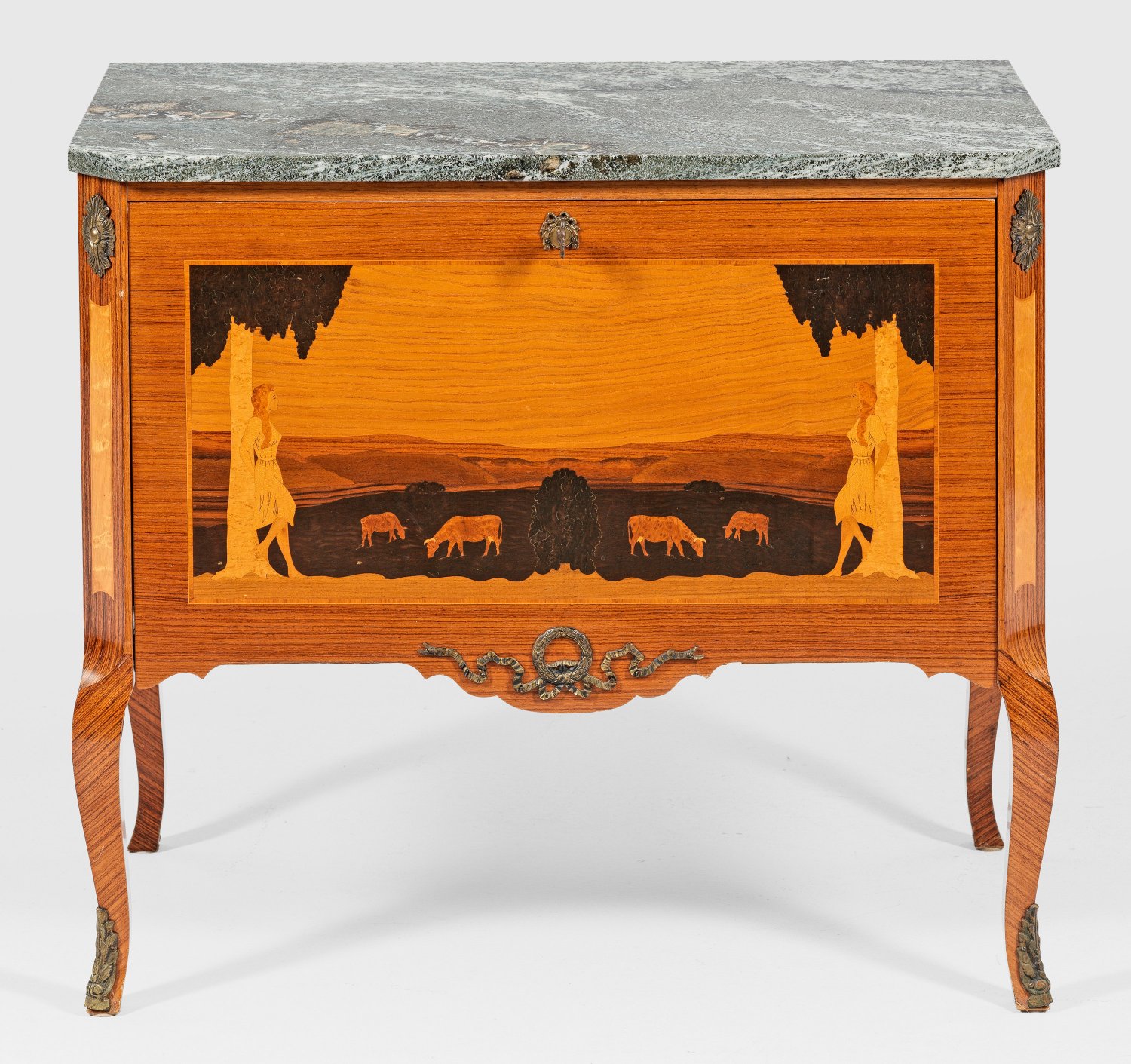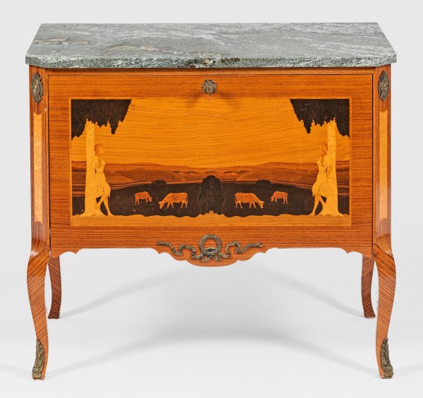 Flächendeckende Marketerie aus unterschiedlichen Hölzern. Gerader, querrechteckig angelegter Korpus, flankiert von schmalen, schräggestellten Ecklisenen, in geschweifte Beine übergehend. In der Front breite, abklappbare Lade mit szenisch angelegtem Furnierbild. Dahinter zwei Schubladen. Gering überstehende Deckplatte aus grün gemasertem Marmor. H. 76 cm. 86 cm x 47 cm.