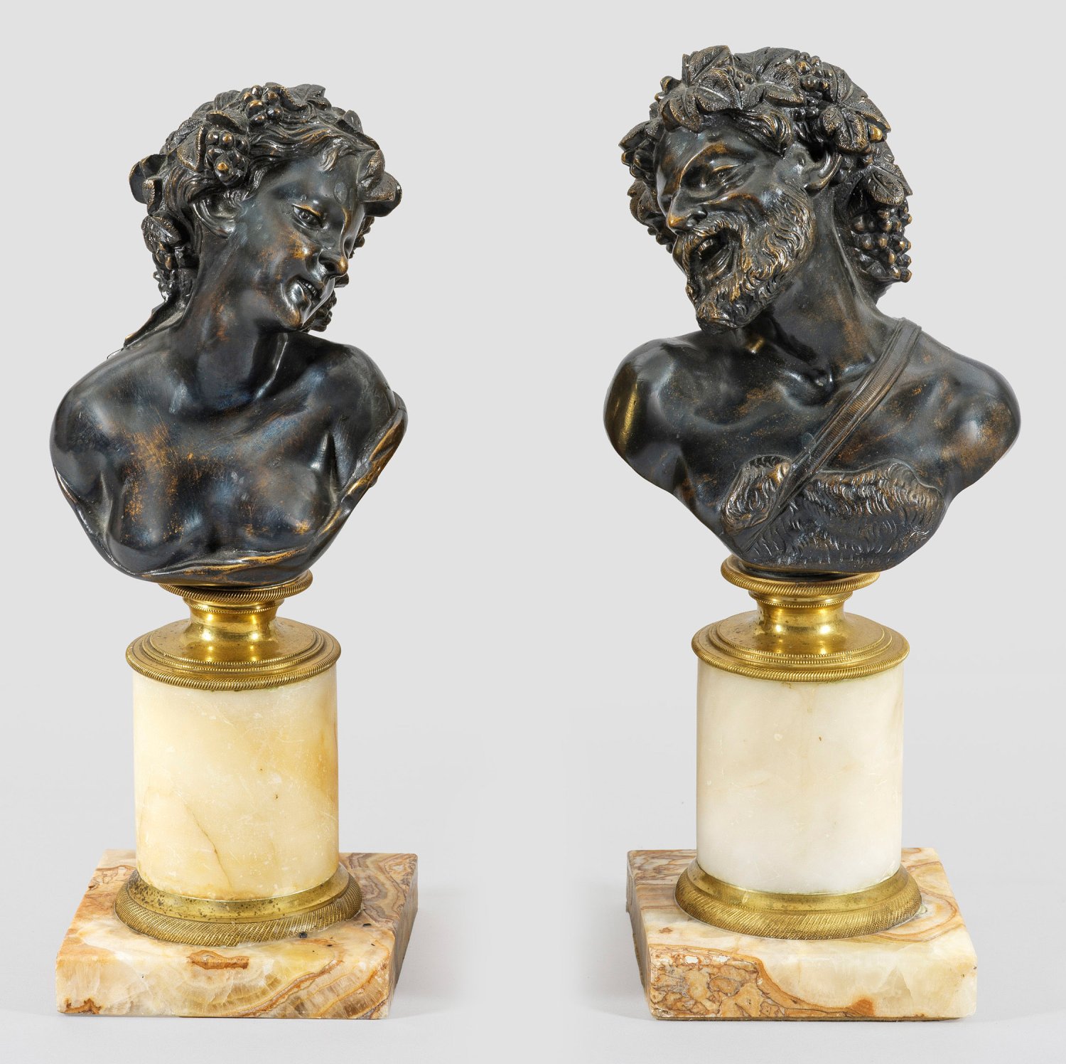 Gegenstücke. Onyx, Bronze vergoldet und dunkel patiniert. Lebendig wiedergegeben mit leicht ins Profil gewandten und geneigten Köpfen. Der bedeutende französische Bildhauer Claude Michel gen. Clodion (1738 Nancy - 1814 Paris), war ein Schüler von Jean-Batiste Pigalle und arbeitete unter dem Pseudonym Clodion. Hauptsujet des für den Hof König Ludwig XVI. und vermögende Privatsammler arbeitenden Künstlers waren mythologische Motive, Faune, Nymphen, Satyrn, Putten und grazile Mädchen. Ges.-H. 30 cm - 31 cm.