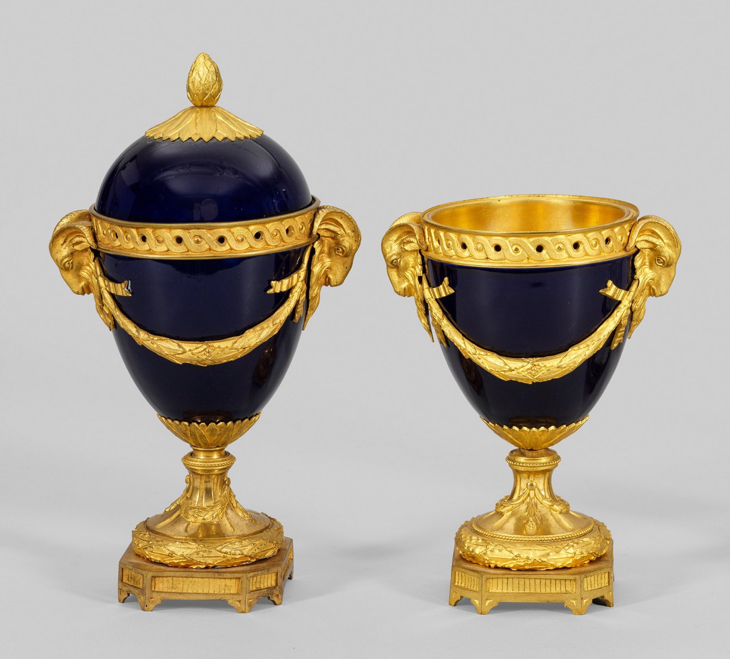 Bronze, vergoldet und Porzellan mit kobaltblauem Fond. Über geschweift ansteigender Basis balusterförmiger Korpus, seitlich mit plastischen Widderköpfen, durch Lorbeerfestons verbunden. Gewölbter Deckel mit Zapfenbekrönung. Besch.; Ein Deckel fehlt. H. 29 cm.