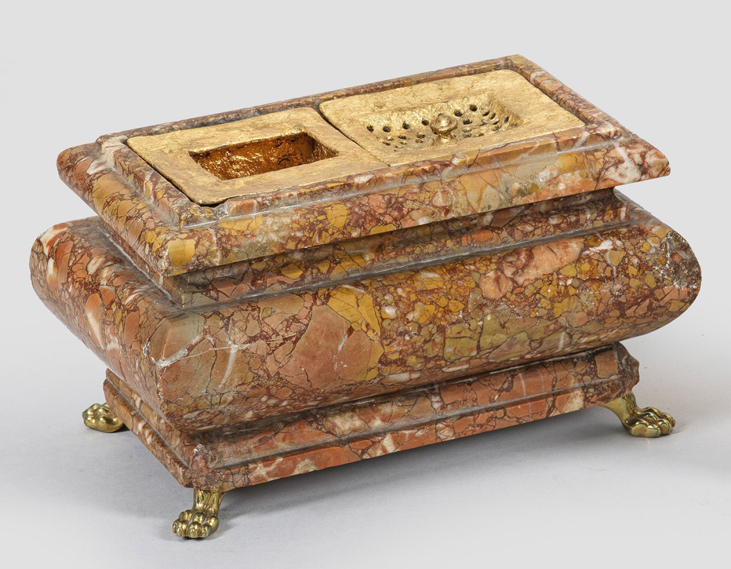 Rotbraun, beige und gelb gemaserter Marmor sowie Metall, vergoldet. Querrechteckig angelegter sarkophagförmiger Korpus auf plastischen Tatzenfüßen. Gekantete Einsätze für Tinte und Streusand. Teilw. best.; H. 11,5 cm. 20 cm x 12 cm.