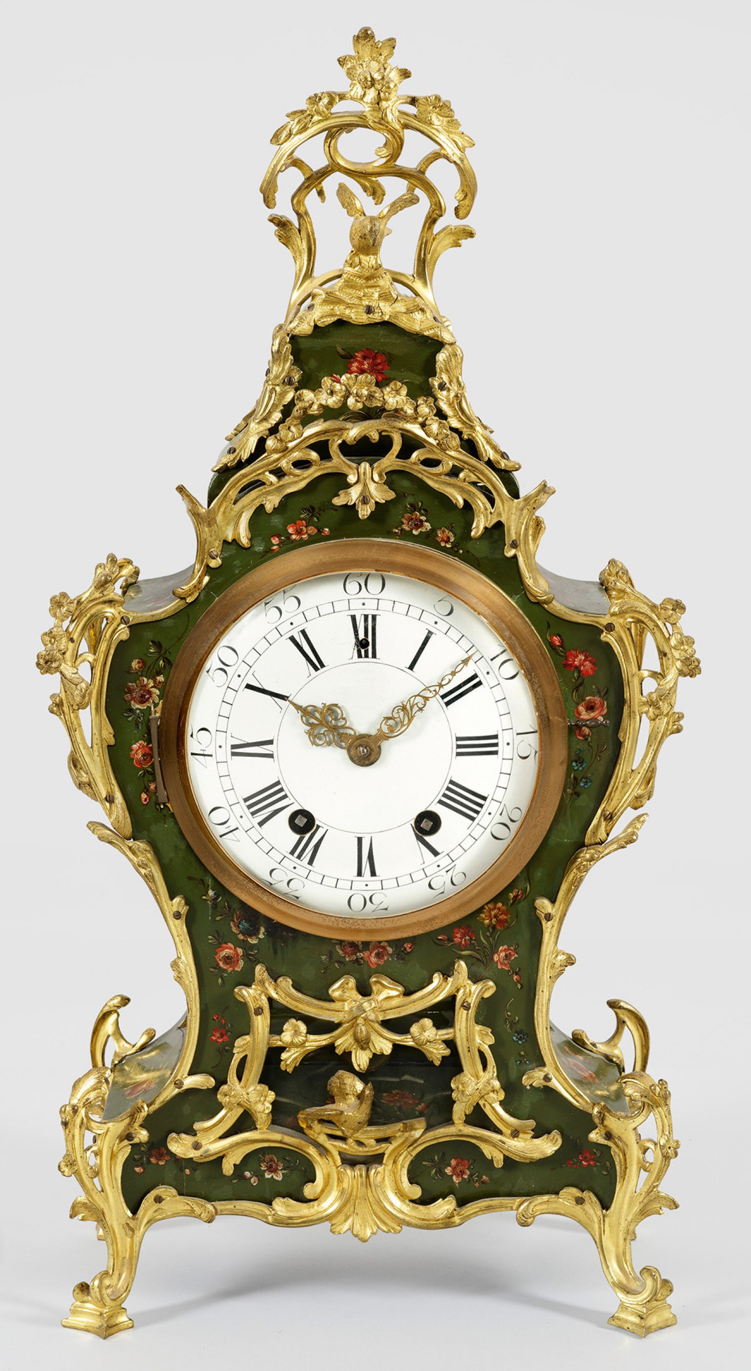 Flächendeckend grüner Lackfond mit polychromem Blütendekor sowie Applikationen aus Bronze. Balusterförmiger, dreiseitig verglaster Korpus, umgeben von Rocaillen mit geschweift ansteigendem oberen Abschluss mit Bekrönung in Form einer Taube. Verglastes Emailzifferblatt. Werk mit Fadenaufhängung sowie Schlagwerk auf Glocke. H. 74 cm. 37 cm x 17 cm.