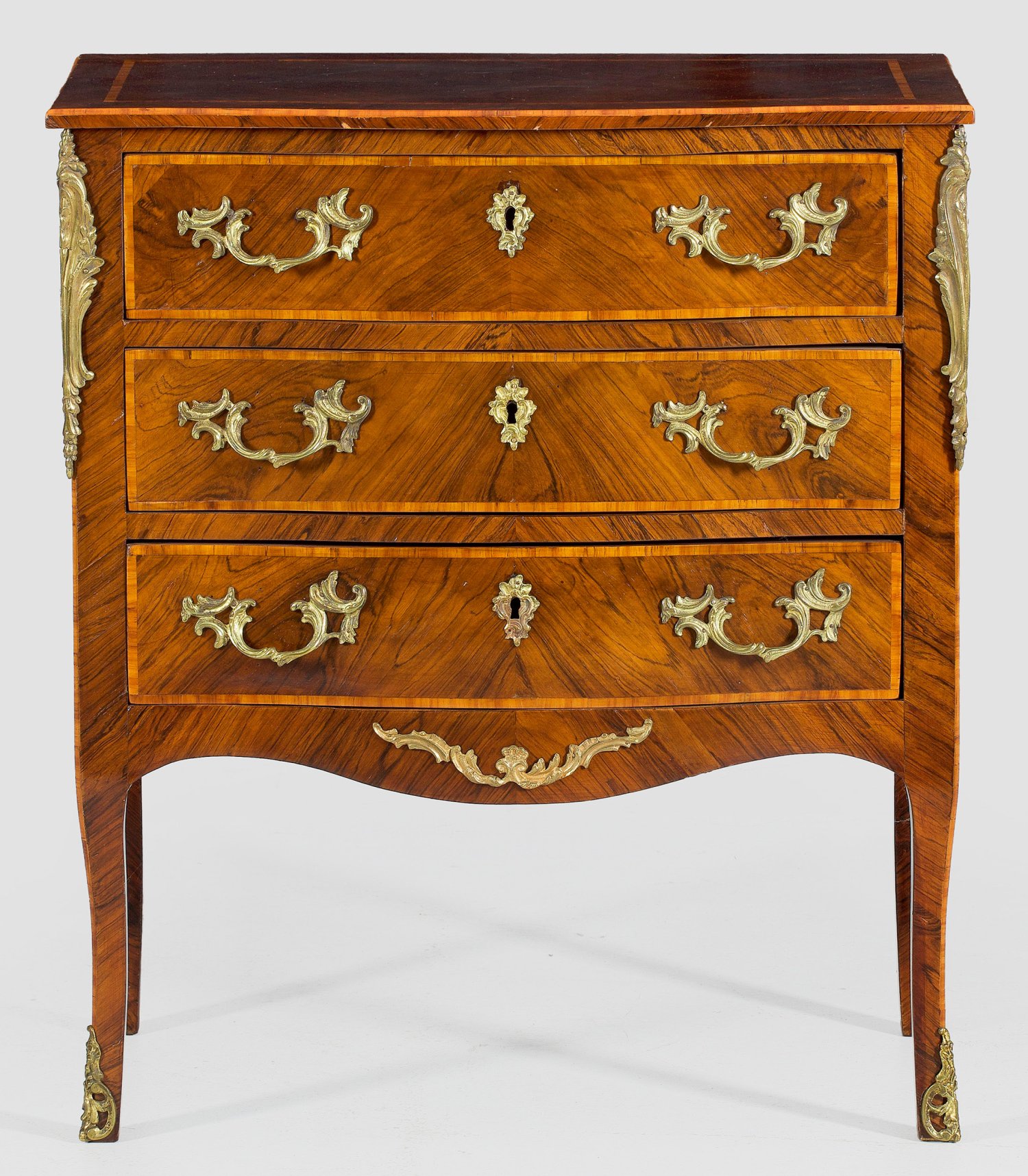 Palisander, furniert sowie Einlagen aus Rosenholz. Rechteckig angelegter Korpus, flankiert von schlanken, leicht ausgezogenen Ecklisenen. In der gegliederten Front drei gering bombierte Schubladen. Korrespondierende Deckplatte. Flächendeckend gespiegelt angeordnete Furnierfelder, teilw. von Bandeinlagen begrenzt. H. 74 cm. 65 cm x 37 cm.