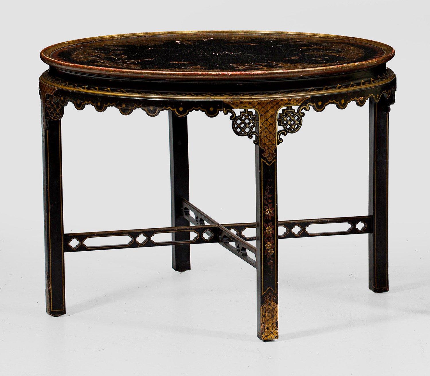 Flächendeckender Fond aus Schwarzlack. Bombierte, passig geschweifte Zarge auf gekanteten Beinen, unterhalb durch durchbrochen gearbeitete Stege verbunden. Runde, umlaufend profilierte Deckplatte. Allseitig goldfarbene, teilw. erhaben reliefierte Dekorationen aus Chinoiserien. H. 66 cm. D. 89 cm.
