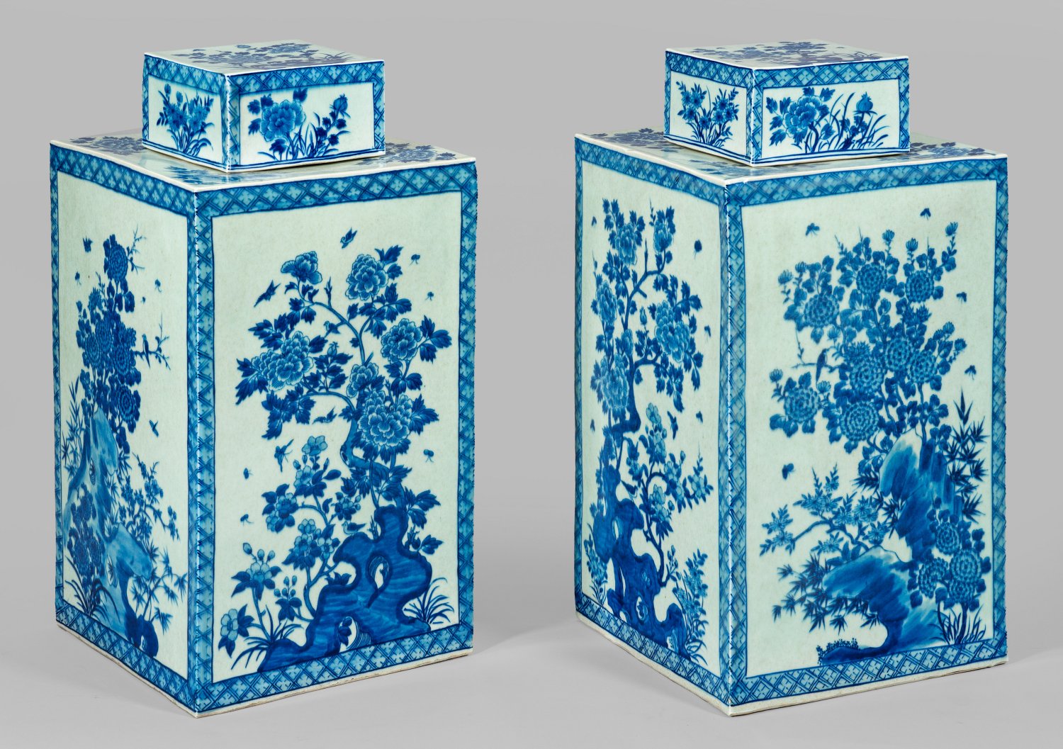 Porzellan, leicht graustichiger Scherben. Hochrechteckiger Korpus, kurzer zylindrischer Hals mit korrespondierendem Deckel. Von Rautengitterbordüre konturierter, flächendeckender Dekor mit Felsen und daraus prächtig emporwachsenden Päonien in unterglasurblauer Malerei. H. 52 cm.