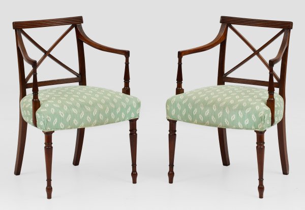 Mahagoni. Trapezförmige Zarge auf schlanken, mehrfach gegliederten Balusterbeinen. Korrespondierende, godronierte Stütze für schmale, geschweift ansteigende Armlehnen, in rechteckige Rückenlehne mit kreuzförmig angelegtem Mittelsteg übergehend. Sitzfläche gepolstert und bezogen. H. 83 cm. 57 cm x 50 cm. Sitz-H. 47 cm.
