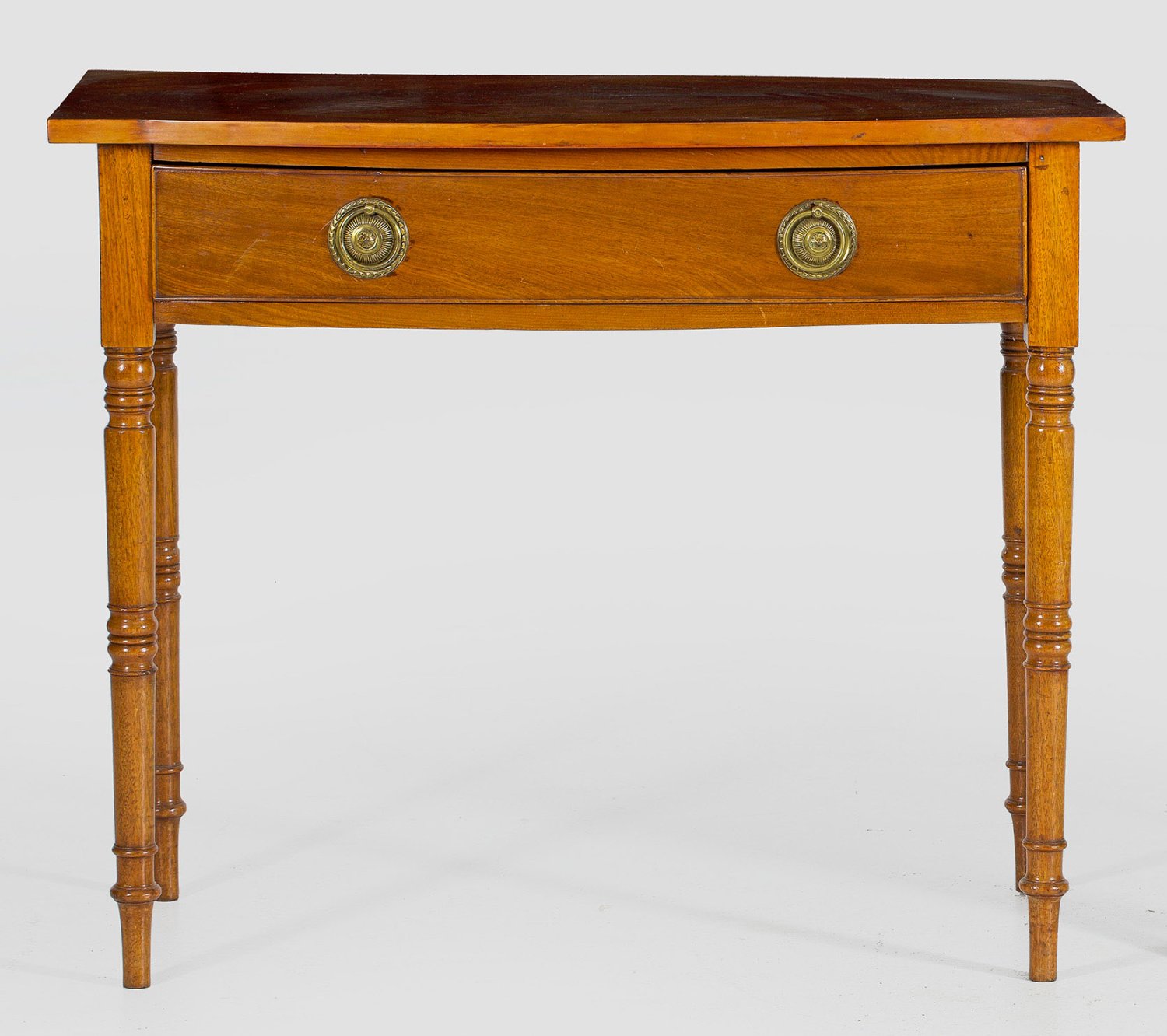 Mahagoni. Gerader, schauseitig bombierter, einschubiger Zargenkasten auf schlanken, mehrfach gegliederten Balusterbeinen. Gering überstehende Deckplatte. H. 78 cm. 94,5 cm x 48 cm.