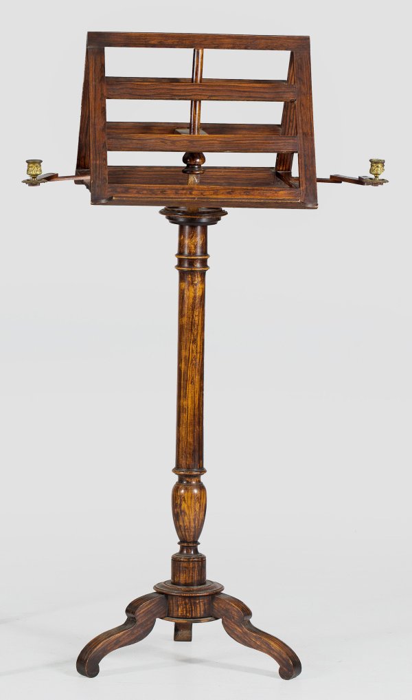 Holz, in Palisanderoptik gebeizt. Mehrfach gegliederter Balusterschaft auf geschweiften Beinen. Oberhalb davon ausgehend höhenverstellbares, beidseitig nutzbares Notenpult mit schwenkbaren Leuchterarmen. H. 128-153 cm.