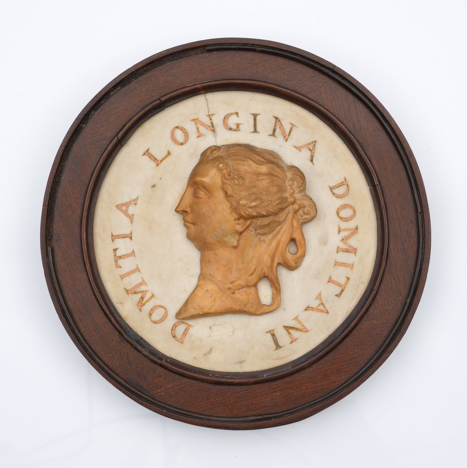 Heller und rötlicher Marmor. Runde Form. Auf heller Marmorplatte mit Inschrift "Domitia Longina Domitani" die in rötlichem Marmor reliefierte Profildarstellung der nach links blickenden Frau des Kaisers Domitian mit hochgebundenem Haar und hängendem Ohrring. Haarrisse, rücks. rest.; D. 25 cm.