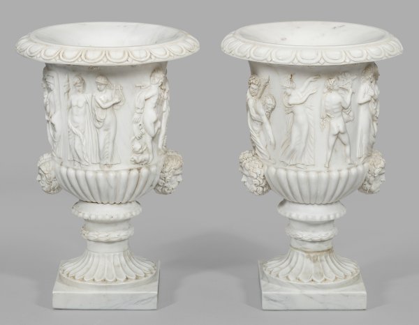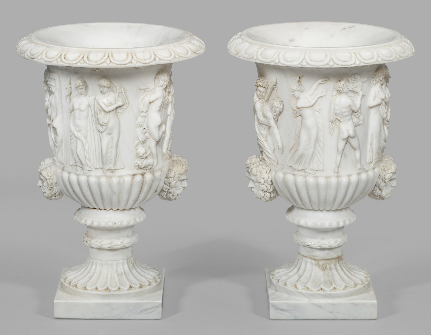 Weißer, cremefarben gemaserter Marmor. Über quadratischer Plinthe kraterförmiger, teilw. godronierter Korpus mit breitem Lippenrand aus Eierstabfries. Umlaufend der Wandung erhaben reliefierte Darstellung eines Bacchantenzugs. Seitlich plastisch gestaltete Maskarons. Als Vorbild diente die berühmte antike, um 40 bis 30 v. Chr. in Athen entstandene und 1569 auf dem Gebiet der Sallustschen Gärten in Rom wiederentdeckte, bis 1808 im Besitz der Familie Borghese befindliche Vase, die seit 1811 im Louvre ausgestellt ist. H. 42,5 cm.