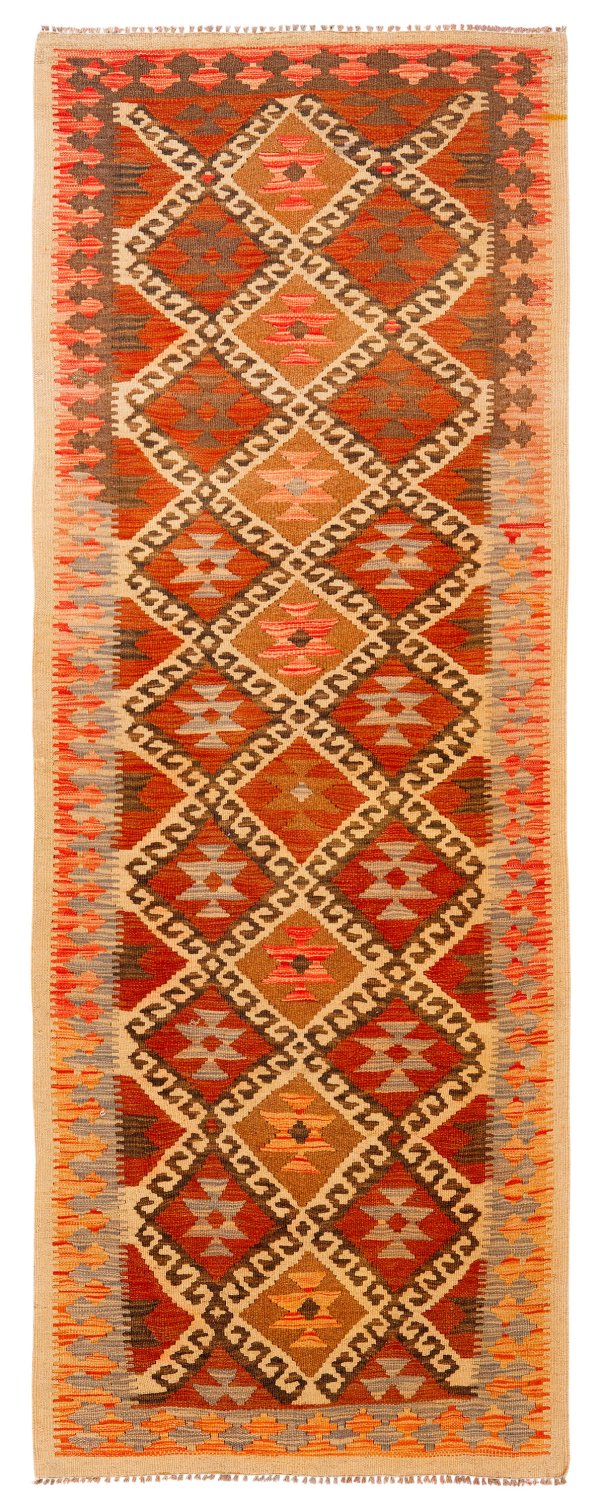 Afghanistan. Wolle auf Wolle, flach gewebt. Auf beigefarbenem Fond flächendeckende Musterung aus dicht angeordneten, hakenbesetzten Rauten aus abraschierten Rot- und Beigetönen. 232 cm x 81 cm.