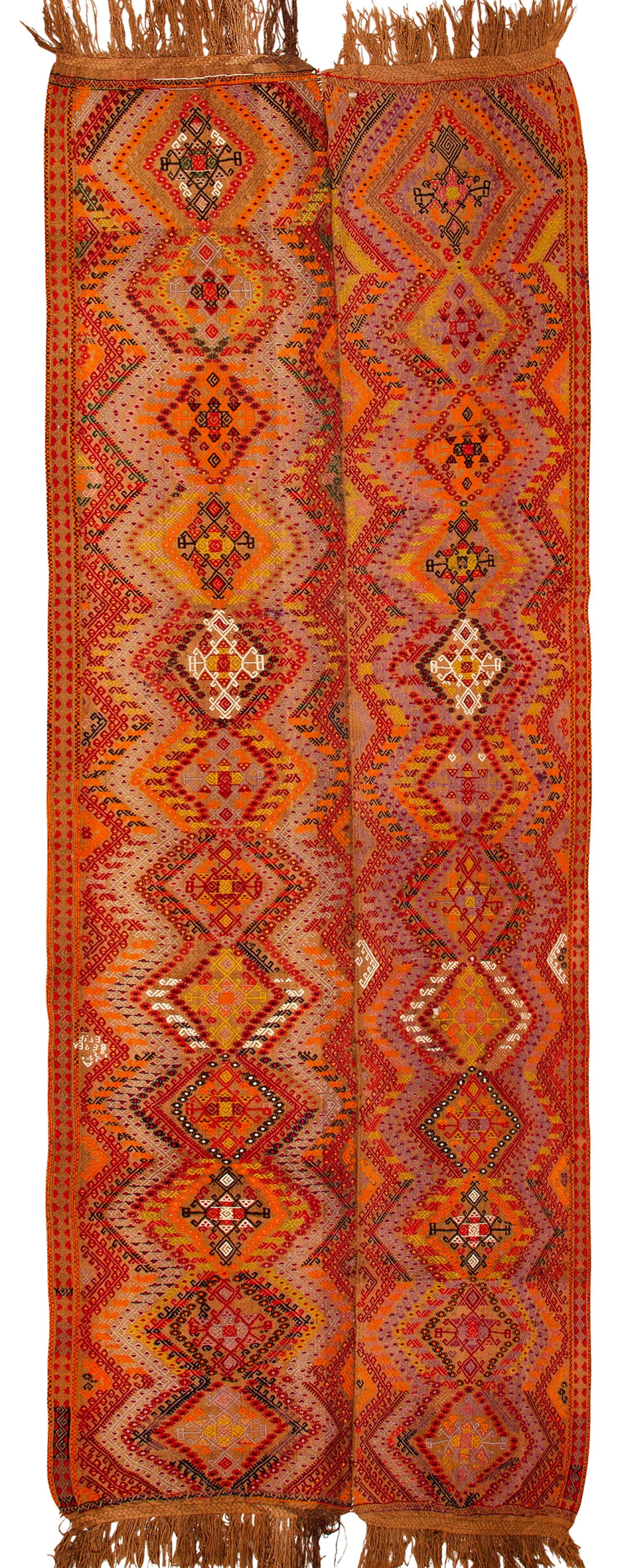 Türkei. Anatolien. Mitte 20. Jh.; Wolle auf Wolle, flach gewebt. Zwei Bahnen aus dicht gereihten und gestaffelt mit Haken besetzten Rauten in unterschiedlichen Rot-, Orange- und Beigetönen. 444 cm x 149 cm.