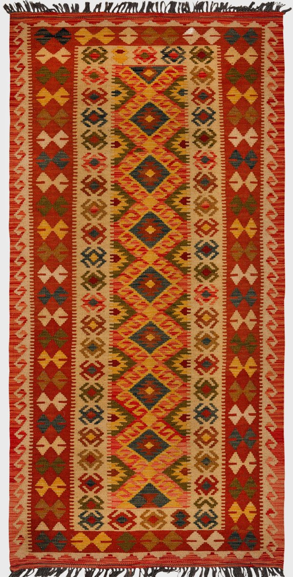 Afghanistan. Wolle auf Wolle, flach gewebt. Im beigefarbenen Innenfeld gestreckte Reserve mit gereihten Rautenmotiven. Umlaufend breite Ornamentbordüre in Rottönen. 214 cm x 102 cm.