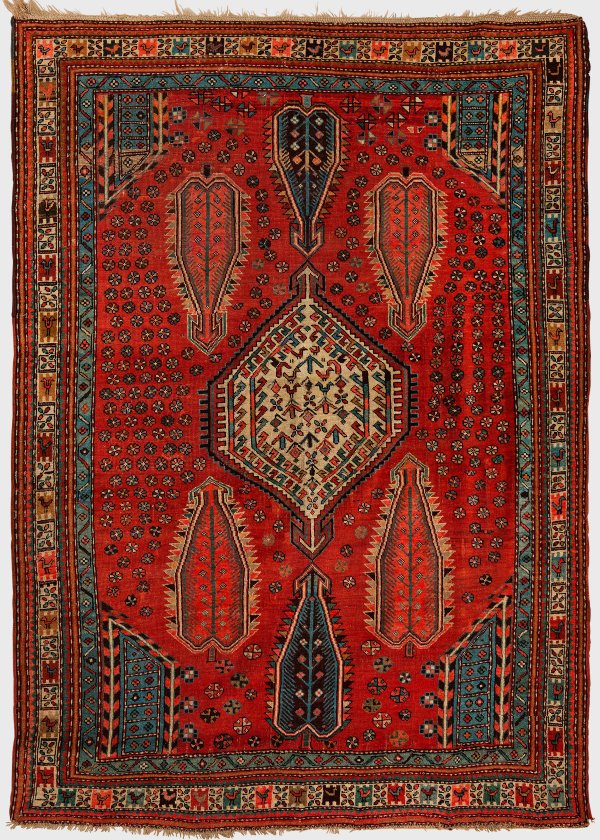 Kaukasus. Um 1920. Wolle auf Wolle. Im roten Innenfeld großes, beigefarbenes Medaillon sowie stilisierte Lebensbäume in Blau- und Orangetönen. Musterung aus lose gestreuten Blütenrosetten. Umlaufend breite Bordüre aus unterschiedlichen Ornamentbändern. 188 cm x 132 cm.