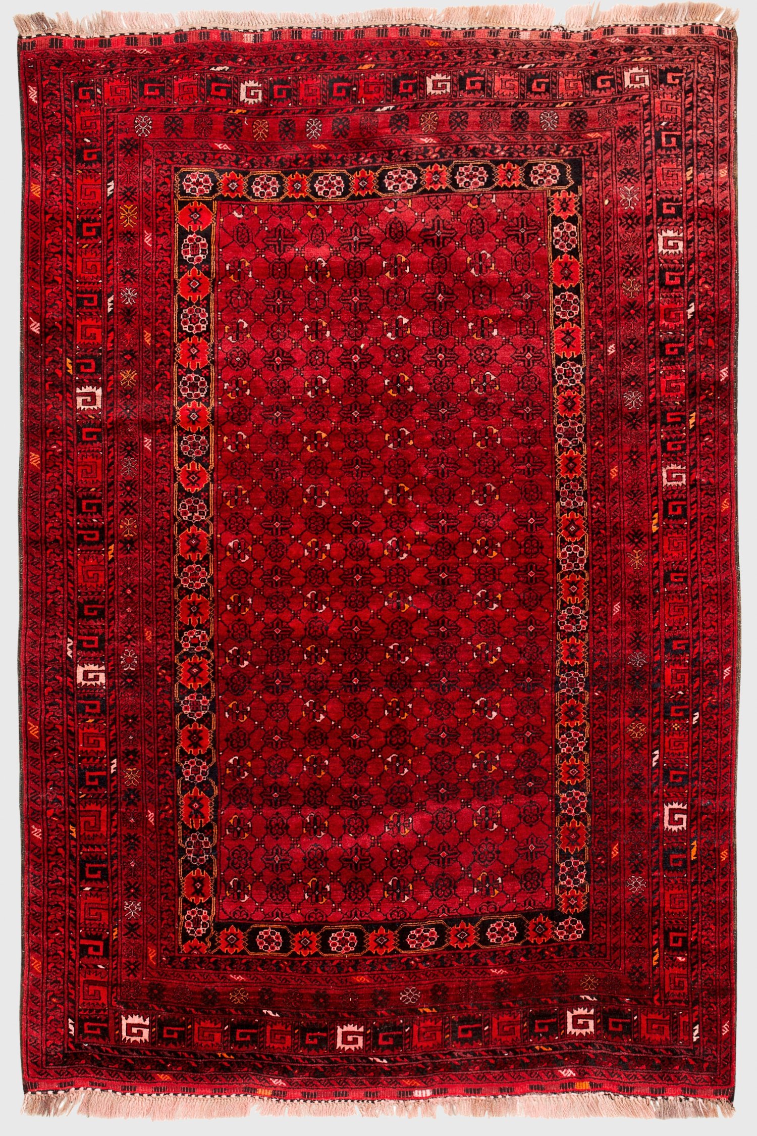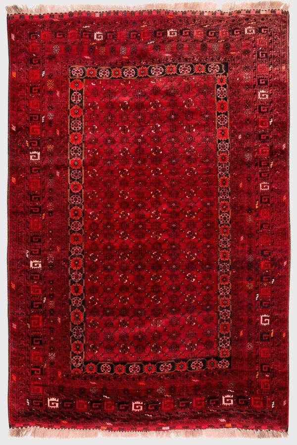 Afghanistan. Wolle auf Wolle. Im dunkelroten Innenfeld flächendeckend durchlaufende Musterung aus gereihten Blütenrosetten im Rapport. Umlaufend breite, vielteilige Ornamentbordüre. 220 cm x 150 cm