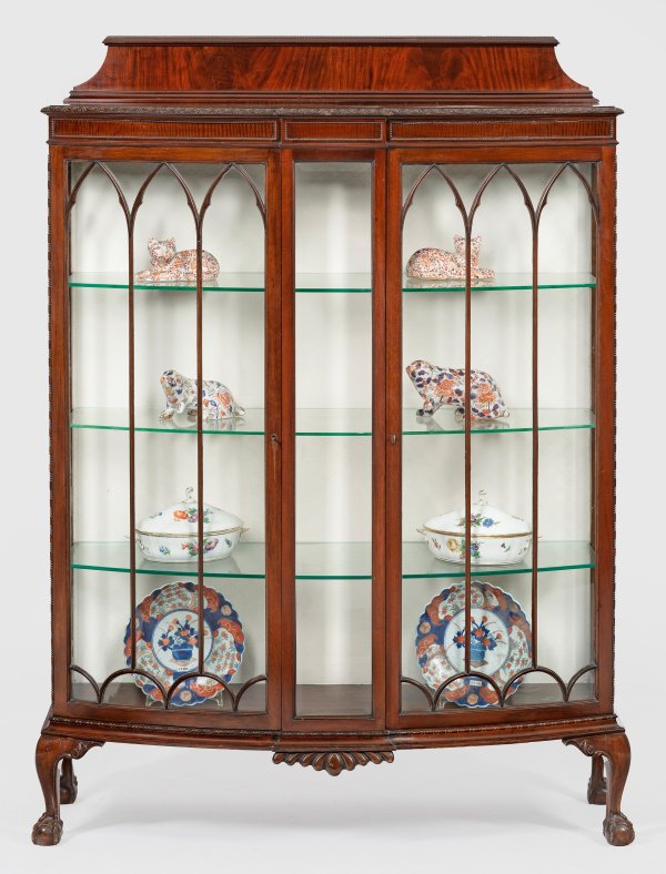 Mahagoni, furniert. Gerader, rechteckig angelegter, dreiseitig verglaster Korpus auf schmaler Profilzarge und reliefplastisch gestalteten Klauenfüßen. In der bombierten Front zwei sprossenverglaste Vitrinentüren. Gering überstehende Deckplatte mit flachem hinteren Abschluss. H. 166 cm. 120 cm x 40 cm.