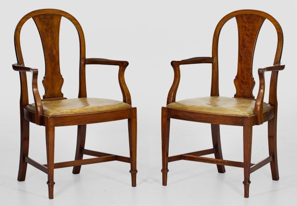 Mahagoni. Trapezförmige, leicht bombierte Zarge, auf konischen Vierkantbeinen, unterhalb durch schmale Stege verbunden. Gebogte Stützen für schmale Armlehnen sowie gewölbte Rückenlehnen mit breitem Mittelsteg. Sitzfläche gepolstert und mit olivgrünem Leder bezogen. Sitz-H. 47 cm.