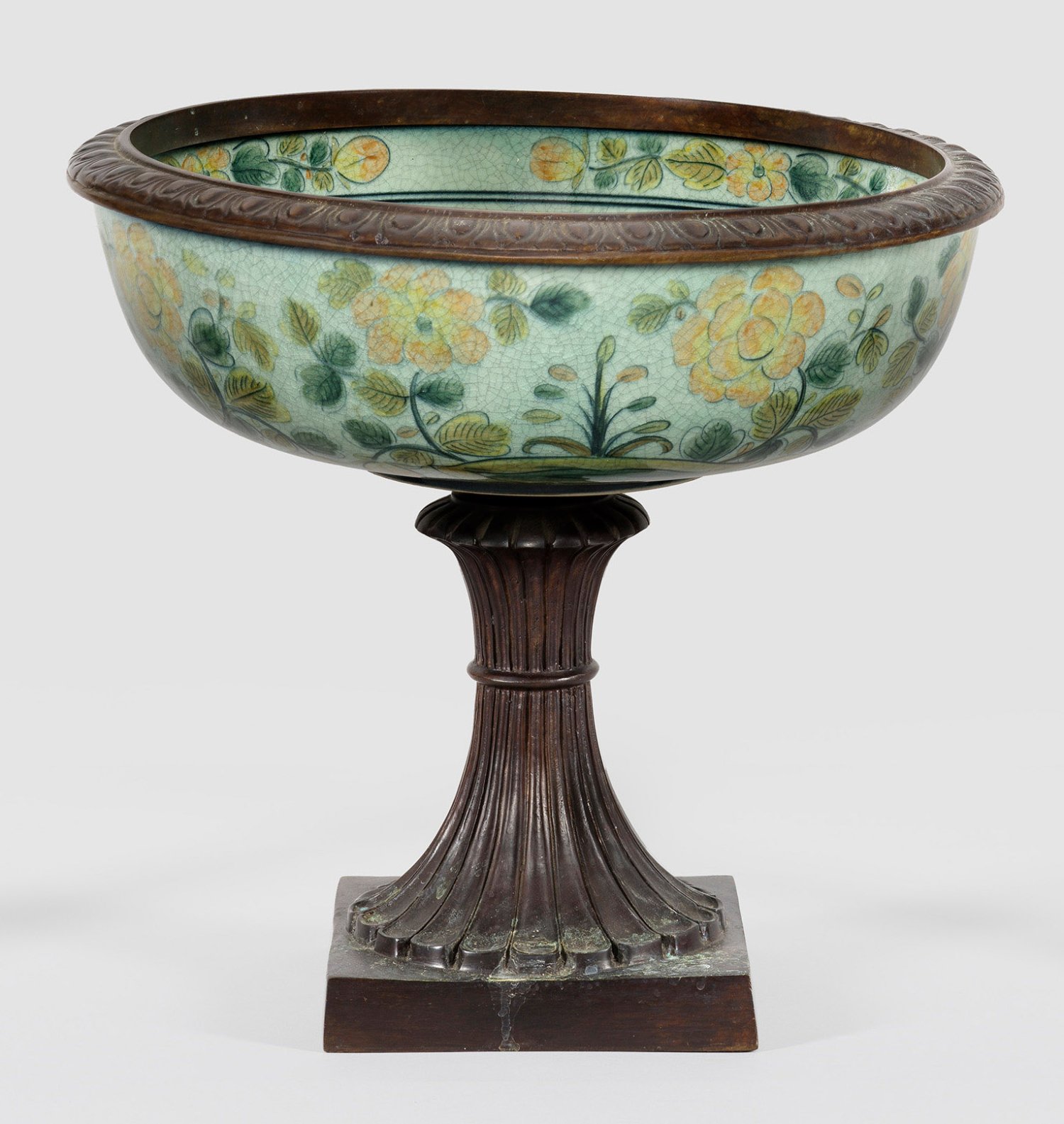 Keramik und dunkel patiniertes Metall. Quadratplinthe mit relefiertem Palmettenfuß. Runde, tief gemuldete Schale mit Eierstab-Konturband. Allseits krakelierte, graustichige Glasur, umlaufend polychrom staffierter Blumendekor. H. 35,5 cm.