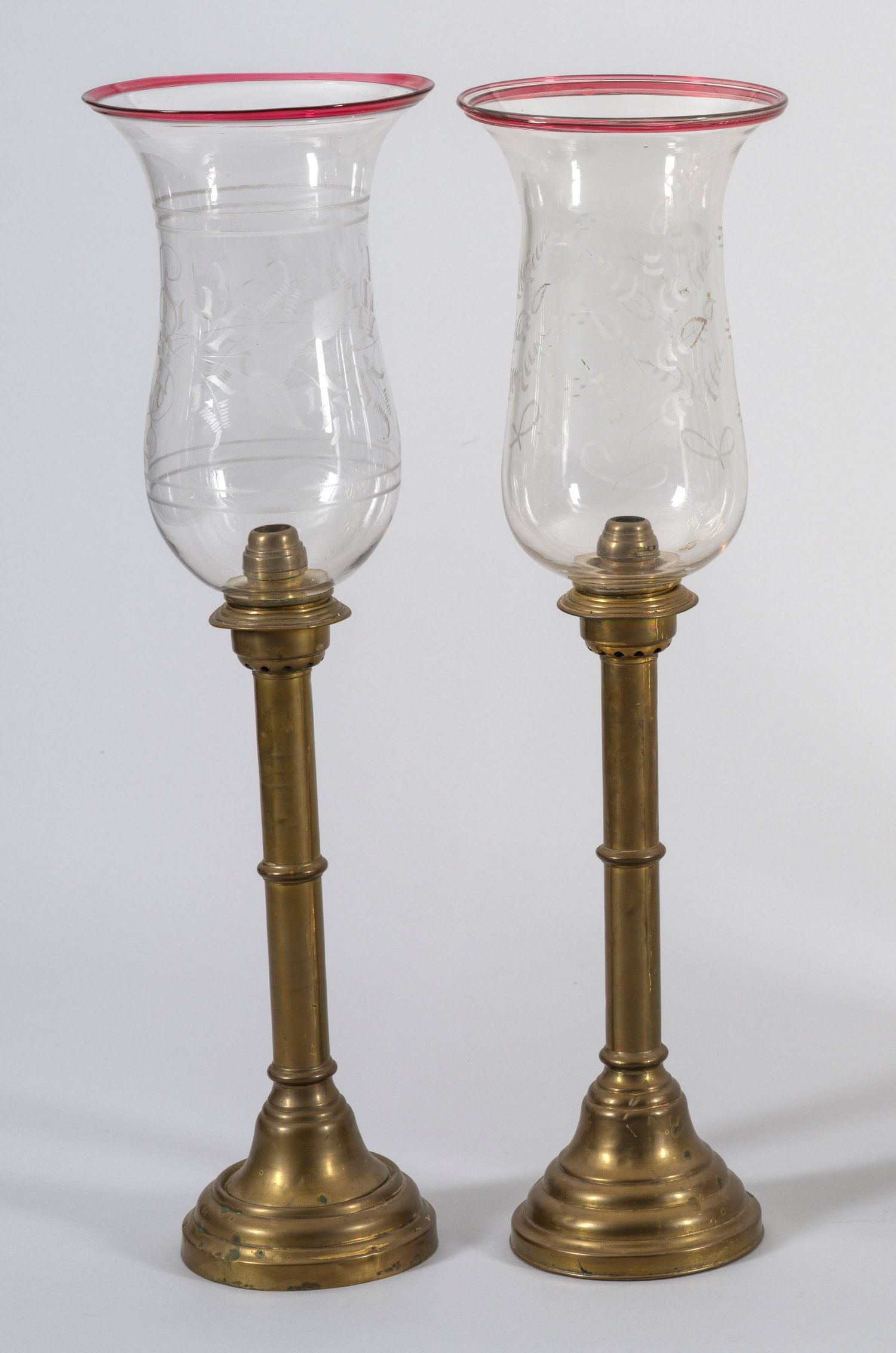 1-flg.; Messing und farbloses, teilw. rubinrotes Glas. Über profilierter Basis zylinderförmiger Schaft als Träger für Leuchtmittel. Balusterförmiger, floral dekorierter Lampenschirm mit weit ausladendem Lippenrand. Altersspuren. H. 59 cm.