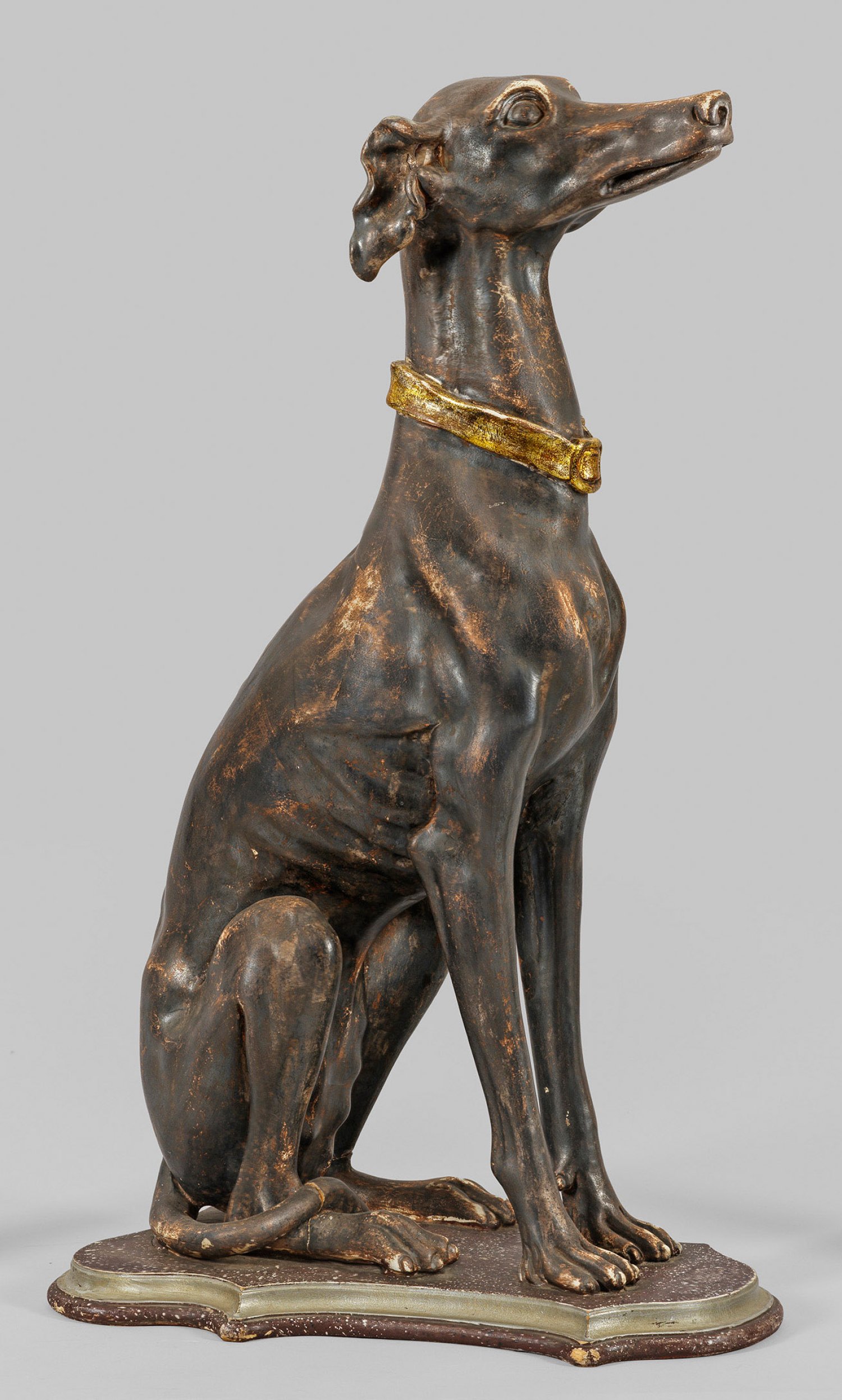 Holz, gefasst. Über passig geschweifter, profilierter Plinthe vollplastische Darstellung eines aufwartenden Windhundes mit breitem Halsband. Altersspuren. H. 76 cm.