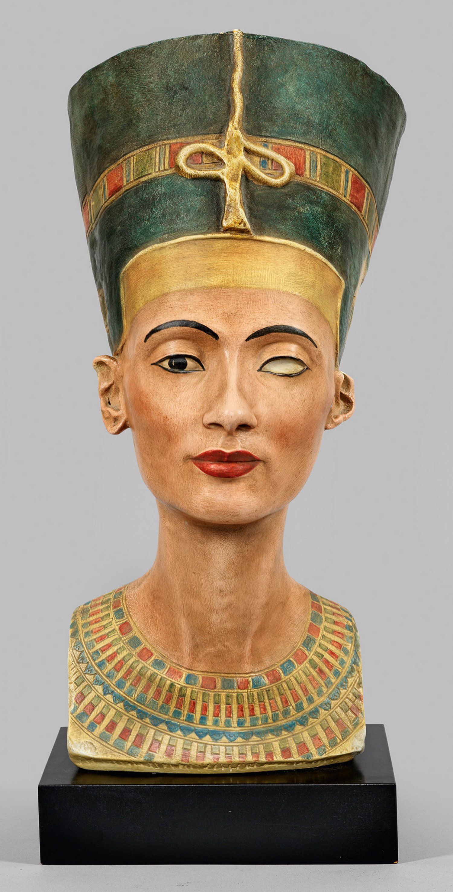Achatit, polychrom bemalt. Ende 20. Jh.; Deutsche Museumsreplik. Schulterstück der ägyptischen Königin Nofretete mit reliefiertem Halsschmuck. Nach dem Vorbild der berühmten Büste der Königin Nofretete (um 1340 v. Chr.) im Ägyptischen Museum in Berlin. Ebonisierter Holzockel. Ges.-H. 52 cm.