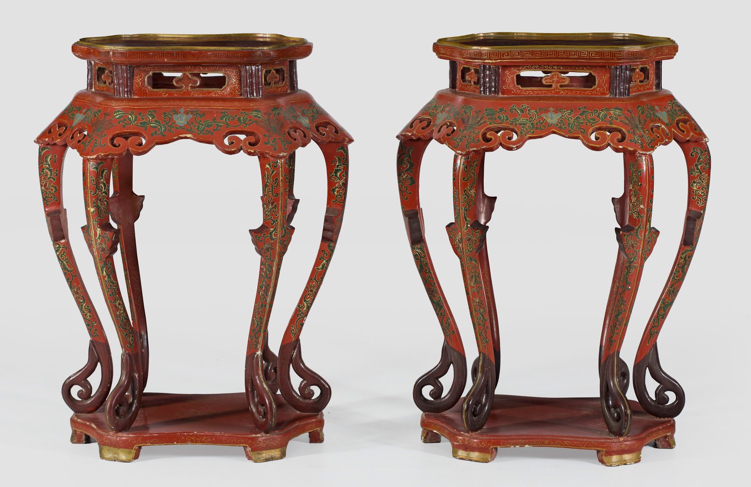 Flächendeckender Fond aus siegelrotem Lack mit akzentuierendem Dekor in Gold und Dunkelgrün. Über kartuschenförmiger Basis volutenförmige Streben. Oberhalb gestuft ansteigende, durchbrochen gearbeitete Zarge sowie profilgerahmte Deckplatte. Allseitig Dekor aus Blattranken. H. 93 cm. 73 cm x 55 cm.