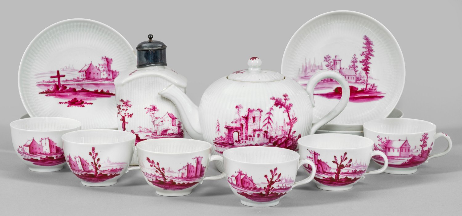 7-tlg.; Kugelig gewölbter Körper mit Reliefdekor "Gebrochener Stab". Auf der Wandung architekturbestandene Landschaft mit Ruinen in feiner Pupur-Camaieumalerei. Silberner Deckel erg.; Unw. rest.; Minim. best.; Purpurfarben gepinselte Manufakturmarke. Kannen-H. 12,5 cm. Tassen-H. 5 cm.