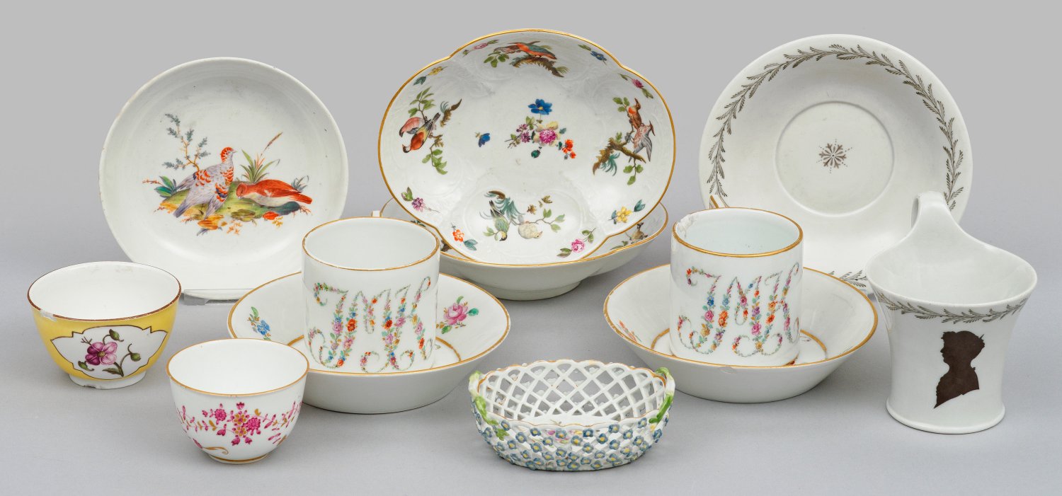 9-tlg.; zwei vierpassige Unterschalen mit Blumen- und Vogeldekor, Koppchen mit Indisch-Purpur- und Golddekor, Gelbfond-Koppchen mit Holzschnittblumen, kleiner, durchbrochen gearbeiteter Zierkorb mit Vergissmeinnichtblüten und Blumendekor, zwei Zylindertassen mit Untertassen und Blütenmonogramm, Silhouttentasse in Kalathosform mit Untertasse sowie Untertasse mit Vogeldekor von Kloster Veilsdorf. Feine polychrome Malerei, teilw. mit Goldstaffage. Partiell besch.; Minim. rest.; Schwertermarke. Zeptermarke. H. 3 cm - 9 cm.