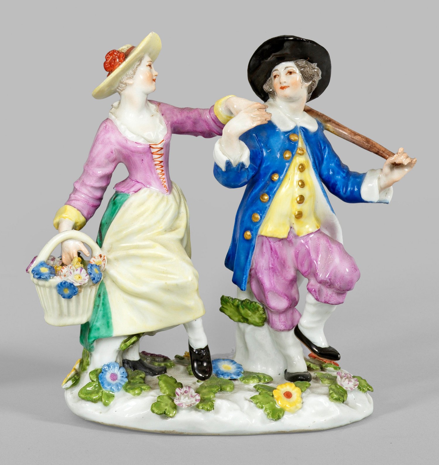 Auf einem ovalen mit plastischen Blüten und Blättern belegtem Sockel stehendes Tanzpaar, der Herr eine Spitzhacke schulternd, die Dame mit Blumenkorb, sich an den Händen haltend. Polychrome Malerei mit dezenter Goldstaffage. Minim. best.; Schwertermarke. H. 10,5 cm.