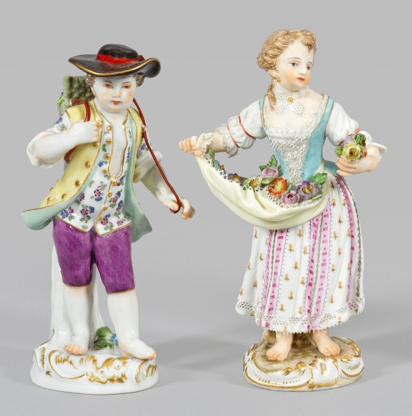 Auf rocaillereliefiertem Sockel stehendes Mädchen mit blütengefüllter Schürze und Blumenkorb bzw. Gärtnerknabe mit Hut und Weinkiepe. Polychrome Malerei mit Goldstaffage. Entw. Johann Joachim Kaendler. Modell-Nr. 2x und 7. Minim. best.; teilw. rest.; Schwertermarke. H. 12,5 cm - 13,5 cm.