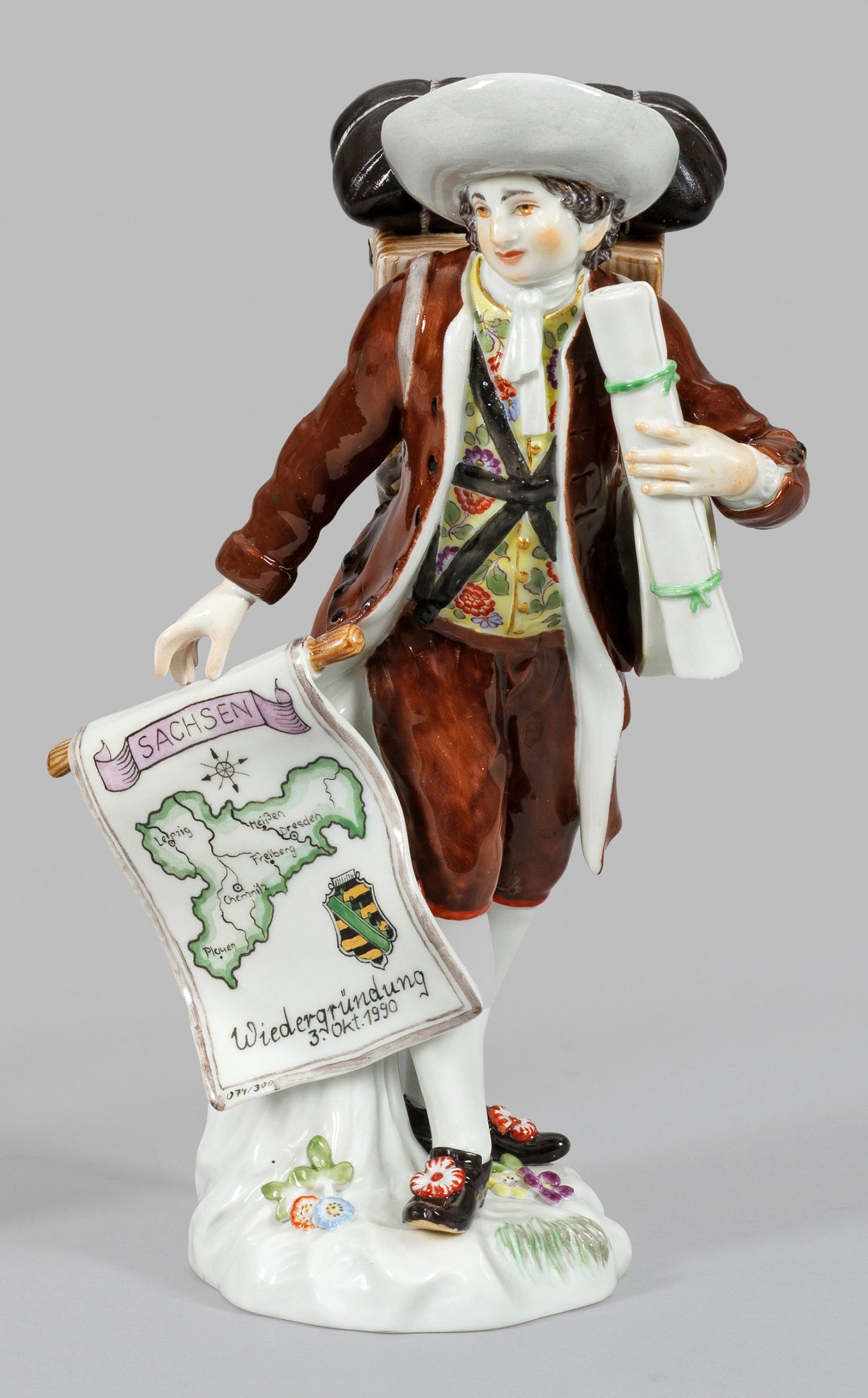 aus der Serie „Cris de Paris“. Auf einem mit plastischen Blüten und Blättern belegtem Natursockel stehender Kartenhändler, bepackt mit einer Transportkiste und Karten, zu seiner Rechten ein Banner mit der Karte von Sachsen präsentierend, bez. „Wiedergründung 3. Okt. 1990“. Polychrome Malerei mit Goldstaffage. Entw. Peter Reinicke. Modell-Nr. 73099. Limitierung „074/300“. Jahreszeichen. Schwertermarke. H. 17,5 cm.