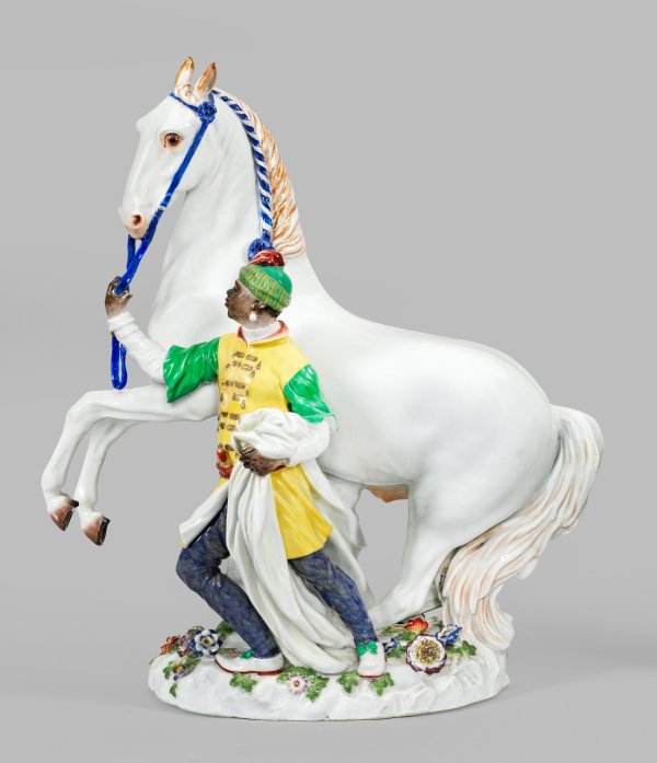 sog. "Mohr mit Pferd". Auf ovalem, mit plastischen Blatt- und Blütenranken belegtem Sockel, ein sich mit den Vorderläufen aufbäumender Schimmel. Seitlich stehender Mohr mit ergriffenen Zügeln das Pferd bändigend. Polychrome Malerei mit dezenter Goldstaffage. Entw. Johann Joachim Kaendler. Modell-Nr. 1067. Best./rest.; Risse. Schwertermarke. H. 43 cm
