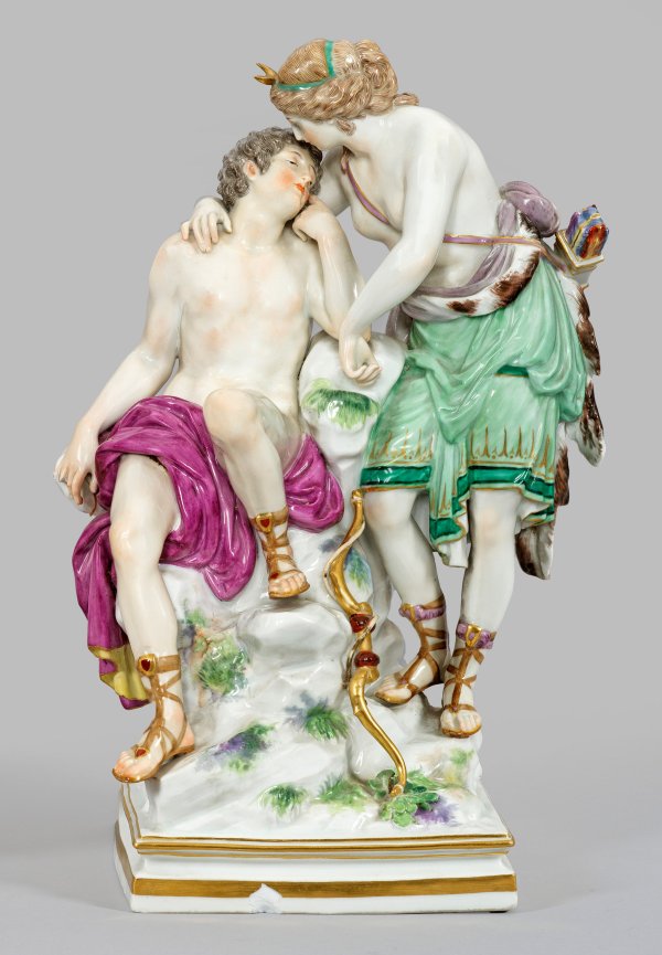 Über quadratischer Profilplinthe, auf naturalistischem Felssockel sitzender, schlafender Endymion. Nebenstehend die sich zu ihm hinabbeugende, sichelbekrönte Göttin Diana als Jägerin in antikisierendem, pelzgefüttertem Mantel mit gefülltem Köcher, liebevoll den rechten Arm um Endymion legend, mit der Absicht ihn zu küssen. Den Bogen hat sie an den Felsen gelehnt. Polychrome Malerei mit Goldstaffage. Entw. Christian Gottfried Jüchtzer. Modell-Nr. I 8, Best./Rest.; Schwertermarke. H. 30,5 cm.