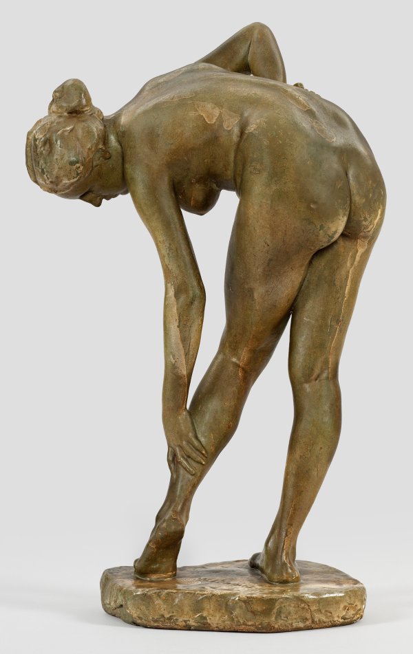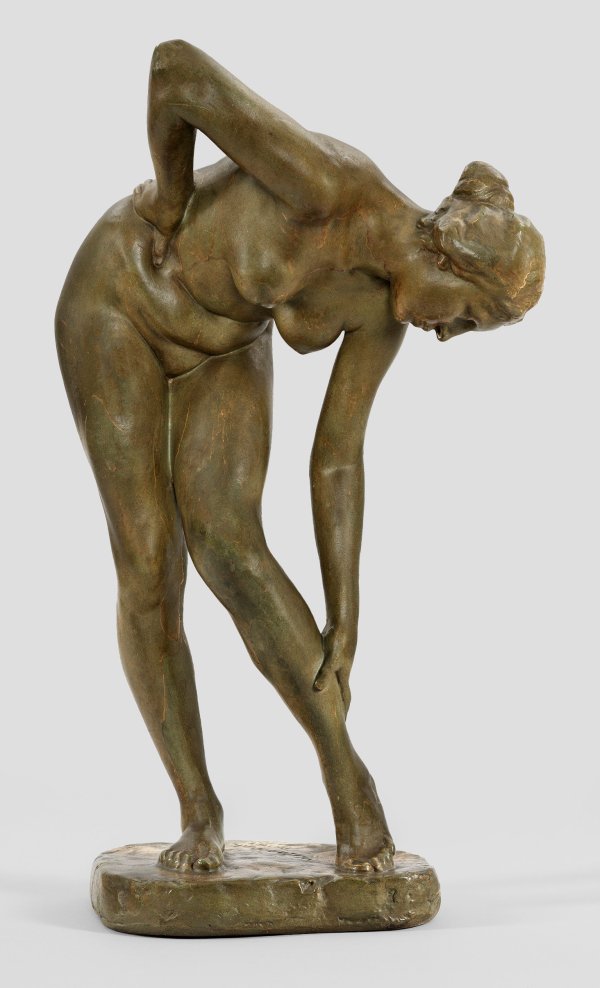 Gips, grüngrau bronzefarben gefasst. Auf der Plinthe sign. u. dat. "D(üsseldor)f. 1902". Wvz. Schubert 11. Die vollplastische Aktstatuette ist eine der ersten bekannten, bildhauerischen Arbeiten von Wilhelm Lehmbruck. Er schuf sie im Jahr 1902, nur ein Jahr zuvor hatte er sein Studium der Bildhauerei bei Karl Janssen an der Kunstakademie Düsseldorf begonnen. Als Meisterschüler Janssens erhielt er ein Stipendium und ein Freiatelier in der Akademie. Im Unterschied zu Lehmbrucks späteren Werken mit ihren expressiv überlängten Formen steht die "Badende" stilistisch durch ihre Haltung und weichen Rundungen des Körpers noch unter dem Einfluss des ausgehenden Naturalismus und ausklingenden Neoklassizismus, wohl noch beeinflusst von Max Klinger. Dem Betrachter bietet sich eine sinnlich unbeschwerte, natürliche Körperlichkeit, die ausgewogen und raumgreifend einen Eindruck des bereits ausgeprägten Formengefühls des erst 21-Jährigen Lehmbruck vermittelt. Die raumgreifende Figur zeigt eine junge Frau, die sich mit ihrer rechten Hand in der Hüfte abstützt und sich mit ihrem Oberkörper über ihr linkes Bein beugt. Das Bein ist dabei leicht eingeknickt und nach innen gedreht, während sie sich mit der linken Hand gedankenversunken über die Wade streicht. Das 1902 datierte "Badende Mädchen" war so erfolgreich, dass nicht nur eine gewisse Anzahl von Bronzegüssen bereits wenige Jahre nach Entstehung des Modells entstanden, sondern auch Ausformungen in Gips. Im Jahr 1905 wurde die Plastik mit dem Preis der Kunstakademie ausgezeichnet und von dieser für die Schülersammlung angekauft. Im darauffolgenden Jahr, im Mai 1906, konnte Lehmbruck seine Arbeit auf der "Deutschen Kunstausstellung" in Köln präsentieren. In einer wohlwollenden schrieb Arnold Fortlage hierzu in der Zeitschrift "Die Rheinlande" (Bd. 12, Juli-Dezember 1906, S. 44 ): Von guten Werken der Kleinplastik gibt es auf der Ausstellung eine ganze Menge (...) An Einzelfiguren ferner (...) das badende Mädchen des jungen Düsseldorfers W. Lehmbruck, eine sehr kompliziert aber glücklich bewegte Figur (...); sehr gut beobachtet ist der Fingereindruck in dem verschobenen weichen Fleisch der Hüfte.". Rest./best.; H. 66,5 cm.