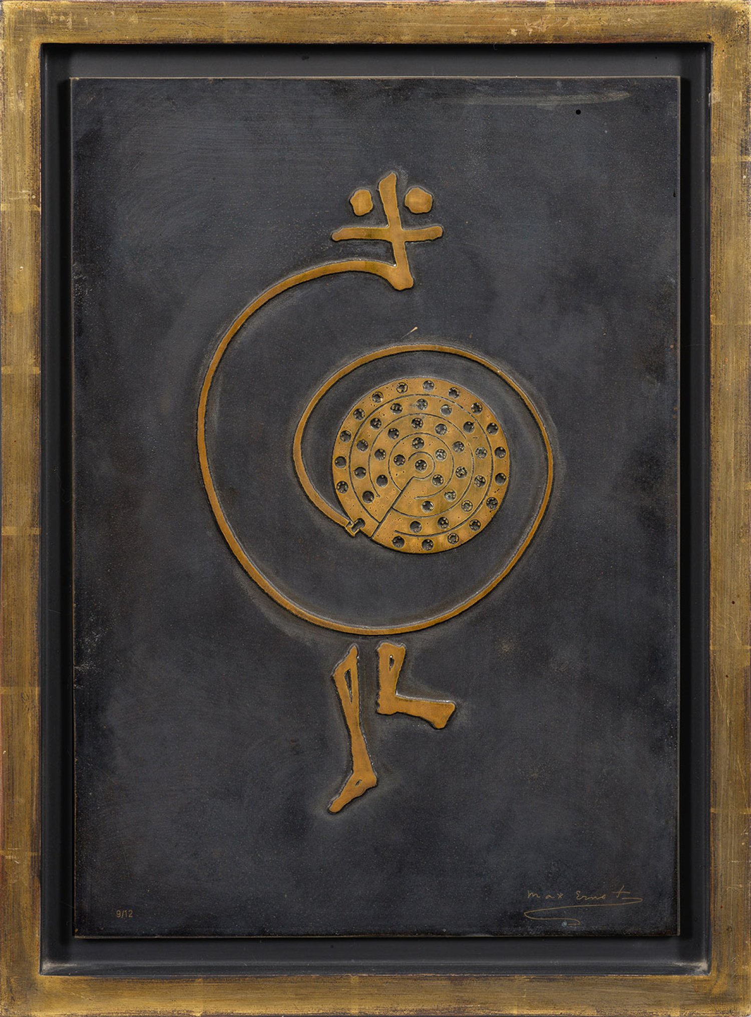 Bronze. Hintergrund dunkel patiniert, das erhabene Relief poliert, 1970. Gravierte Signatur, nummeriert 9/12 (gestempelt). Edition manus presse, Stuttgart, 1970. Das vorliegende Objekt stammt aus der Serie von zwölf von Max Ernst geschaffenen Reliefs mit eigens von ihm hierfür gestalteter Signatur. Die Edition manus presse schreibt hierzu: "Auf der Suche nach dem Bindeglied zwischen zwei wichtigen Polen in Max Ernsts Werk, der zweidimensionalen Grafik und der dreidimensionalen Skulptur, entstanden die (...) Bronzen, die alle 1970 realisiert wurden. Die Idee zur Zahl der zwölf Motive in einer Auflage von zwölf Exemplaren stammte von Max Ernst, der sich immer gern mit der Bedeutung von Zahlen beschäftigt hatte (...) Die Themenauswahl geschah aus den in der Stuttgarter Galerie manus presse verlegten Grafikfolgen, wobei die Motive Variationen und Überarbeitungen von Max Ernst unterworfen wurden. Zum Teil standen hier sehr grafische Motive im Vordergrund; aber auch verdichtete Bildlösungen waren zum Ausgangspunkt der Bronzen gemacht worden.". Ca. 41,5 cm x 29,5 cm. Rahmen.