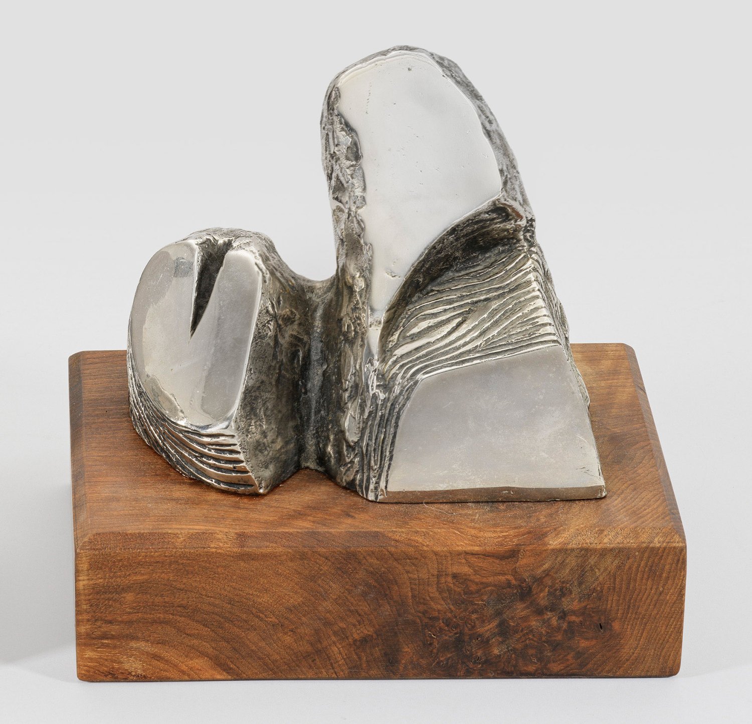 Abstract sculpture. Metal (bronze?), nickel or chromeplated, wooden base. Inscribed and titled "Sin titulo" on a label on the bottom.